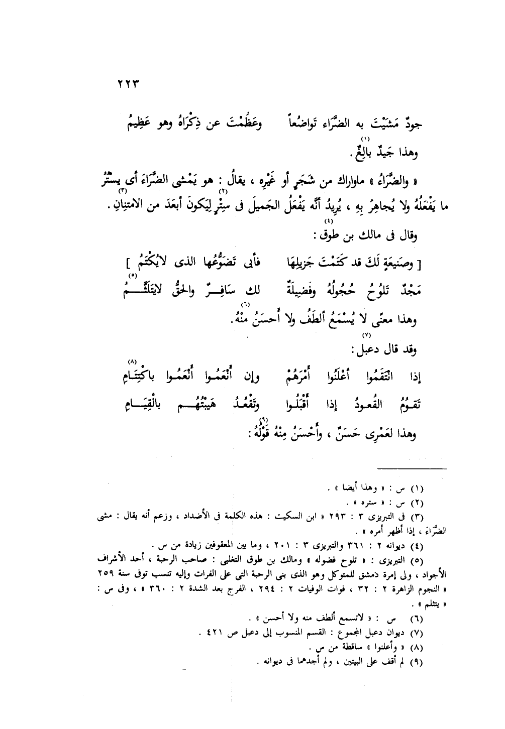 «والضراء» ما واراك من شجر أو غيره، يقال: هو يمشي الضراء أي يستر ما يفعله ولا يجاهر به، يريد أنه يفعل الجميل في ستر ليكون أبعد من الامتنان.
