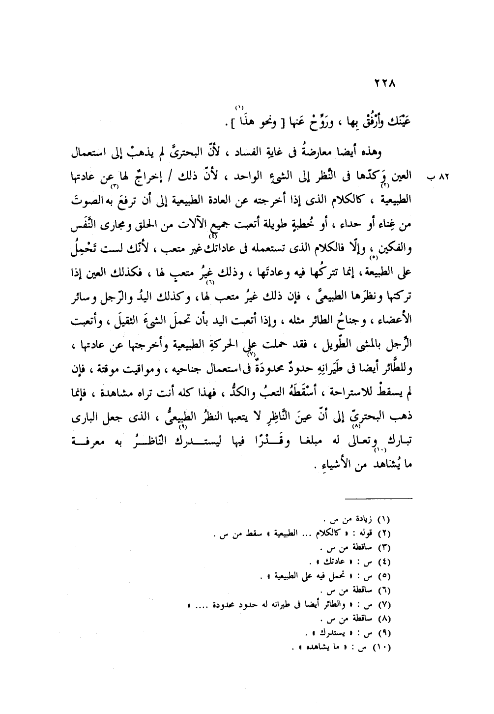 وهذه أيضاً معارضة في غاية الفساد، لأن البحتري لم يذهب إلى استعمال العين وكذها في النظر إلى الشيء الواحد، لأن ذلك إخراج لها عن عادتها الطبيعية، كالكلام الذي إذا أخرجته عن العادة الطبيعية إلى أن ترفع به الصوت من غناء أو حداء، أو خطبة طويلة أتعبت جميع الآلات من الحلق ومجاري النفس والفكين، وإلا فالكلام الذي تستعمله في عاداتك غير متعب، لأنك لست تحمل على الطبيعة، إنما تتركها فيه وعادتها، وذلك غير متعب لها، وكذلك اليد والرجل وسائر الأعضاء، وجناح الطائر مثله، وإذا أتعبت اليد بأن تحمل الشيء الثقيل، وأتعبت الرجل بالمشي الطويل، فقد حكلت على الحركة الطبيعية وأخرجتها عن عادتها، وللطائر أيضاً في طيرانه حدود محمودة في استعمال جناحيه، ومواقيت موقتة، فإن لم يسقط للاستراحة، أسقطه التعب والكد، فهذا كله أنت تراه مشاهدة، فإنما ذهب البحتري إلى أن عين الناظر لا يتعبها النظر الطبيعي، الذي جعل الباري تبارك وتعالى له مبلغاً وقدراً فيها ليستدرك الناظر به معرفة ما يشاهد من الأشياء.