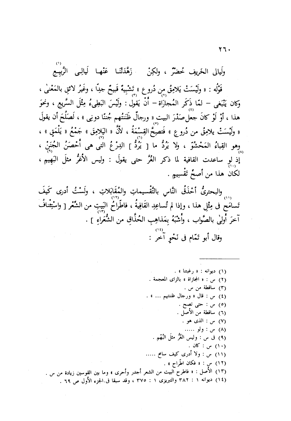 قوله: «وليست يلامق من دروع» تشبيه قبيح جداً، وغير لائق بالمعنى، وكان ينبغي -لما ذكر المجاراة- أن يقول: وليس البطيء مثل السريع، ونحو هذا، أو لو كان جعل صدر البيت «ورجال ظننتهم جنناً دوني»، لصلح أن يقول «وليست يلامق دروع» فتصح القسمة، لأن «اليلامق» جمع «يلمق»، وهو القباء المحشو، ولا يرد ما يرد الدرع التي هي أحصن الجنن، إذ لو ساعدت القافية لما ذكر الغر حتى يقول: وليس الأغر مثل البهيم، لكان هذا من أصح تقسيم.