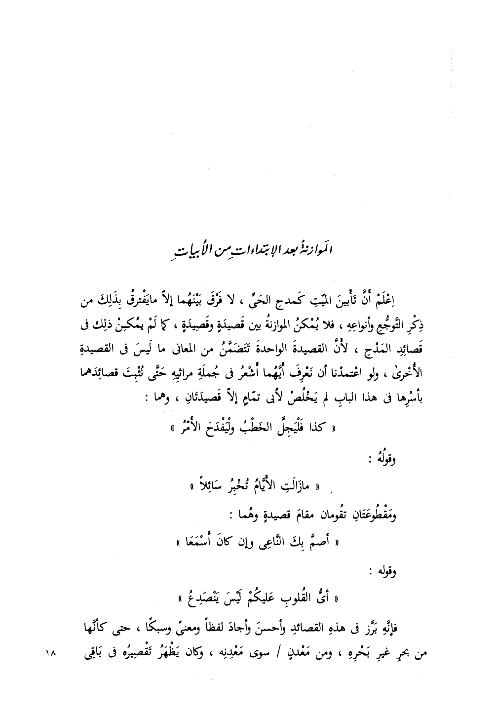 اعلم أن تأبين الميت كمدح الحي، لا فرق بينهما إلا ما يفترق بذلك من ذكر التوجع وأنواعه، فلا يمكن الموازنة بين قصيدة وقصيدة، كما لم يمكن ذلك في قصائد المدح، لأن القصيدة الواحدة تتضمن من المعاني ما ليس في القصيدة الأخرى، ولو اعتمدنا أن نعرف أيهما أشعر في جملة مراثيه حتى نثبت قصائدهما بأسرها في هذا الباب لم يخلص لأبي تمام إلا قصيدتان، وهما:
