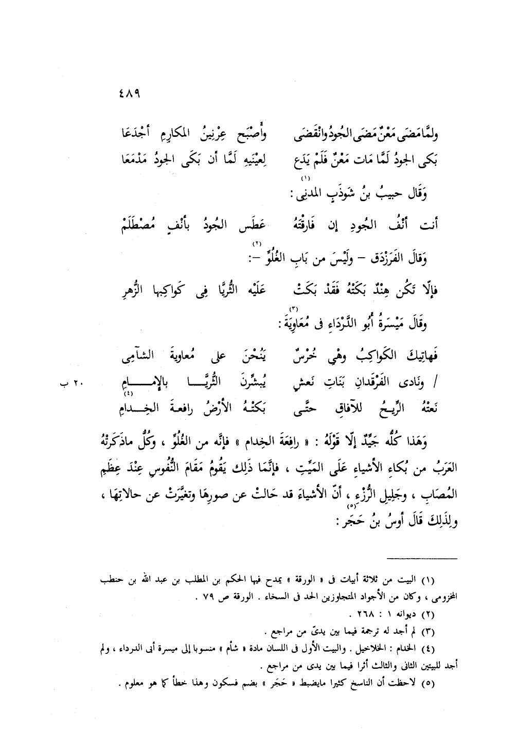 وهذا كله جيد إلا قوله: «رافعة الخدام» فإنه من الغلو، وكل ما ذكرته العرب من بكاء الأشياء على الميت، فإنما ذلك يقوم مقام النفوس عند عظم المصاب وجليل الرزء، أن الأشياء قد حالت عن صورها وتغيرت عن حالاتها، ولذلك قال أوس بن حجر: