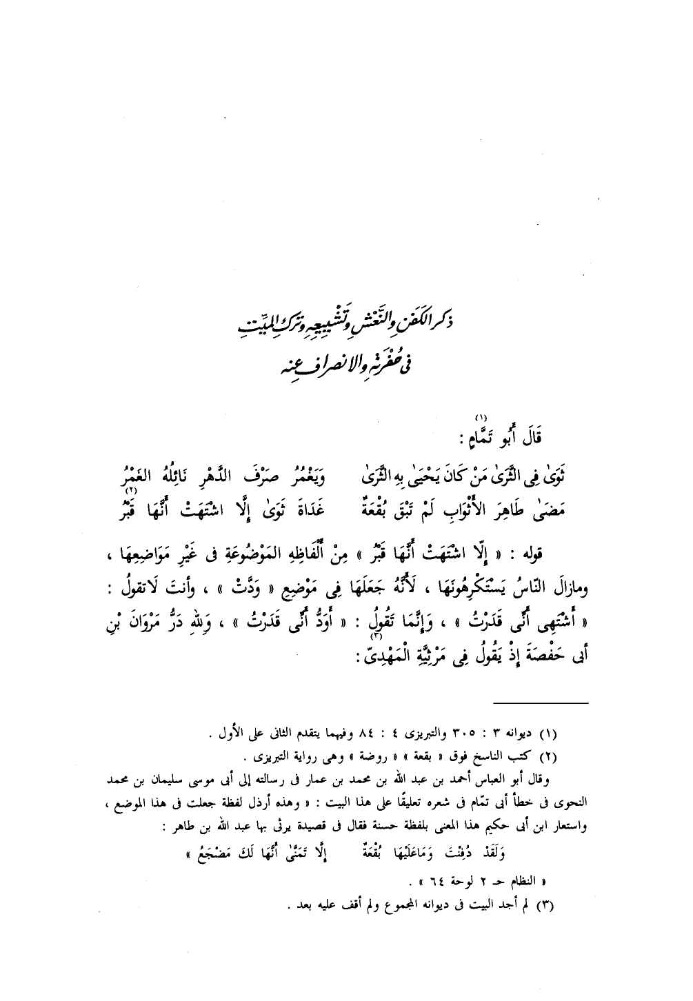 قوله: «إلا اشتهت أنها قبر» من ألفاظه الموضوعة في غير مواضعها، وما زال الناس يستنكرونها، لأنه في موضع «ودت»، وأنت لاتقول: «أشتهي أني قدرت»،وإنما تقول: «أود أني قدرت»، ولله در مروان بن أبي حفصة إذ يقول في مرثية المهدي: