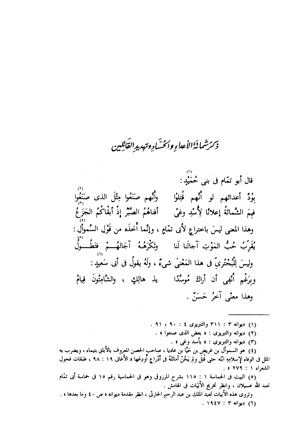 وهذا المعنى ليس باختراع لأبي تمام، وإنما أخذه من قول السموأل: