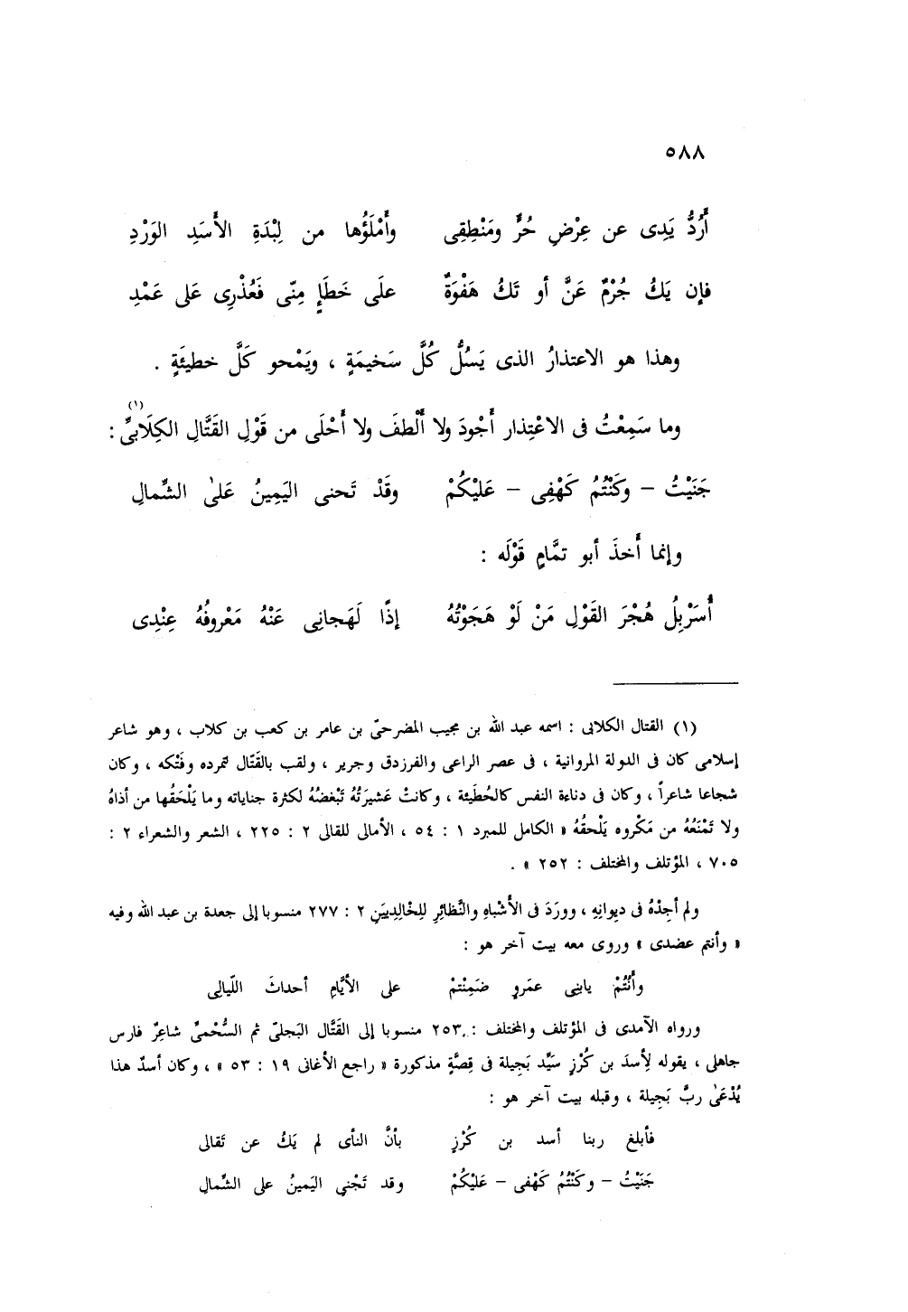 وما سمعت في الاعتذار أجود ولا ألطف ولا أحلى من قول القتال الكلابي:
