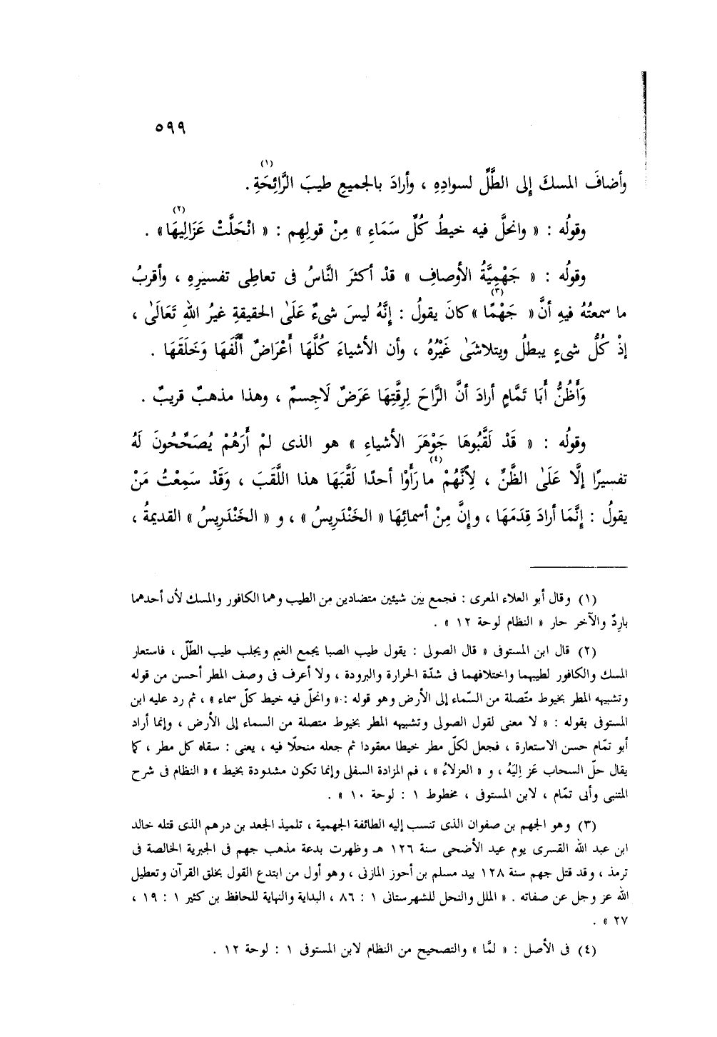 وقوله: «جهمية الأوصاف» قد أكثر الناس في تعاطي تفسيره، وأقرب ما سمعته فيه أن «جهماً» كان يقول: إنه ليس شيء على الحقيقة غير الله تعالى، إذ كل شيء يبطل ويتلاشى غيره، وأن الأشياء كلها أعراض ألفها وخلقها.