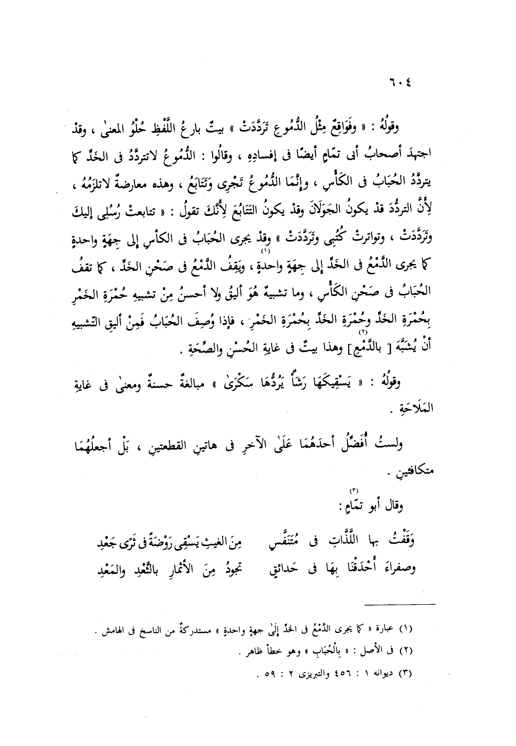 وقوله: «وفواقع مثل الدموع ترددت» بيت بارع اللفظ حلو المعنى، وقد اجتهد أصحاب أبي تمام أيضاً في إفساده، وقالوا: الدموع لا تردد في الخد كما يتردد الحباب في الكأس، وإنما الدموع تجري وتتابع، وهذه معارضة لا تلزمه، لأن التردد قد يكون الجولان وقد يكون التتابع لأنك تقول: «تتابعت رسلي إليك وترددت، وتواترت كتبي وترددت» وقد يجري الحباب في الكأس إلى جهة واحدة كما يجري الدمع في الخد إلى جهة واحدة، ويقف الدمع في صحن الخد، كما تقف الحباب في صحن الكأس، وما تشبيه هو أليق ولا أحسن من تشبيه حمرة الخمر بحمرة الخد وحمرة الخد بحمرة الخمر، فإذا وصف الحباب فمن أليق التشبيه أن يشبه بالدمع وهذا بيت في غاية الحسن والصحة.