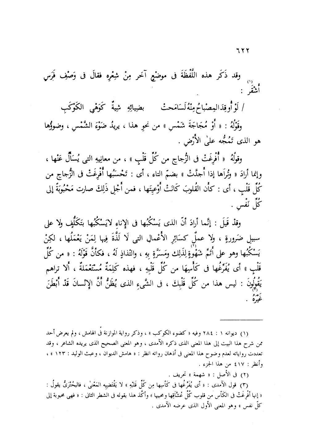 وقوله: «أفرغت في الزجاج من كل قلب»، من معانيه التي يسألأ عنها، وإنما أراد «وتراها إذا أجدت» بضم التاء، أي: تحسبها أفرغت في الزجاج من كل قلب، أي: كأن القلوب كانت أوعيتها، فمن أجل ذلك صارت محبوبة إلى كل نفس.