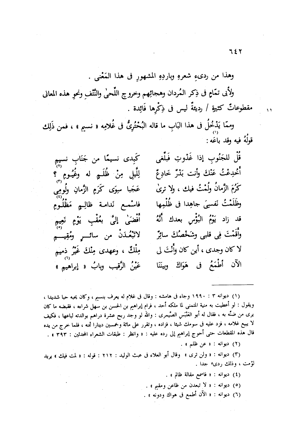 ومما يدخل في هذا الباب ما قاله البحتري في غلامه نسيم فمن ذلك قوله فيه وقد باعه: