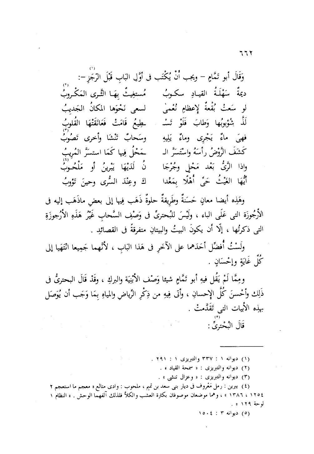 وهذه أيضاً معان حسنة وطريقة حلوة ذهب فيها إلى بعض ما ذهب إليه في الأرجوزة التي على الباء، وليس للبحتري في وصف السحاب غير هذه الأرجوزة التي ذكرتها، إلا أن يكون البيت والبيتان متفرقة في القصائد.