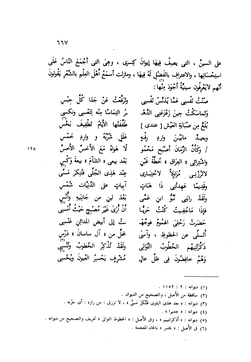 على السين، التي يصف فيها إيوان كسرى، وهي التي أجمع الناس على استحسانها، والاعتراف بالفضل له فيها، وما زلت أسمع أهل العلم بالشعر يقولون أنهم لا يعرفون سينية أجود منها: