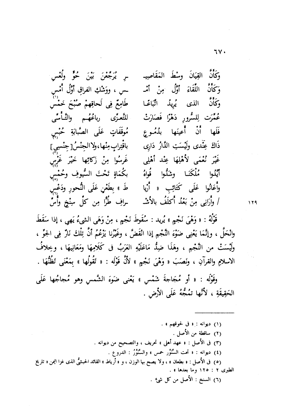 قوله: «وهي نجم» يريد: سقوط نجم، من وهي الشيء يهي، إذا سقط وانحل، وإنما يعني ضوء النجم إذا انقض، وغيرنا يزعم أن تلك نار في الجو، وليست من النجم، وهذا ضد ما عليه العرب في كلامها ومعانيها، وخلاف الإسلام والقرآن، ونصب «وهي نجم» لأن قوله: «تقولها» بمعنى تظنها.