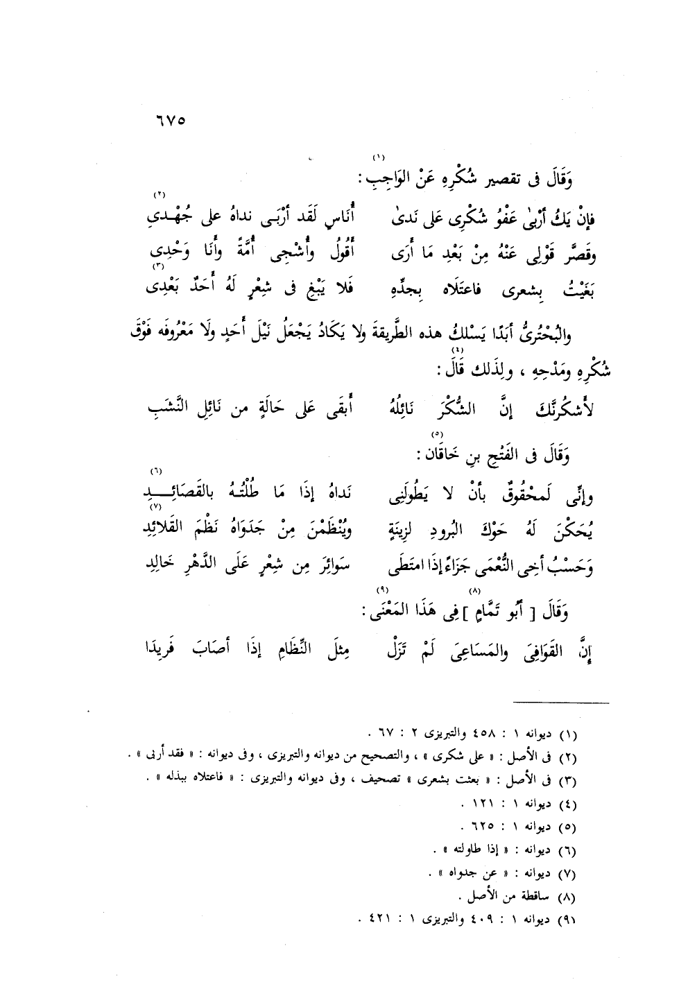 والبحتري أبداً يسلك هذه الطريقة ولا يكاد يجعل نيل أحد ولا معروفه فوق شكره ومدحه، ولذلك قال: