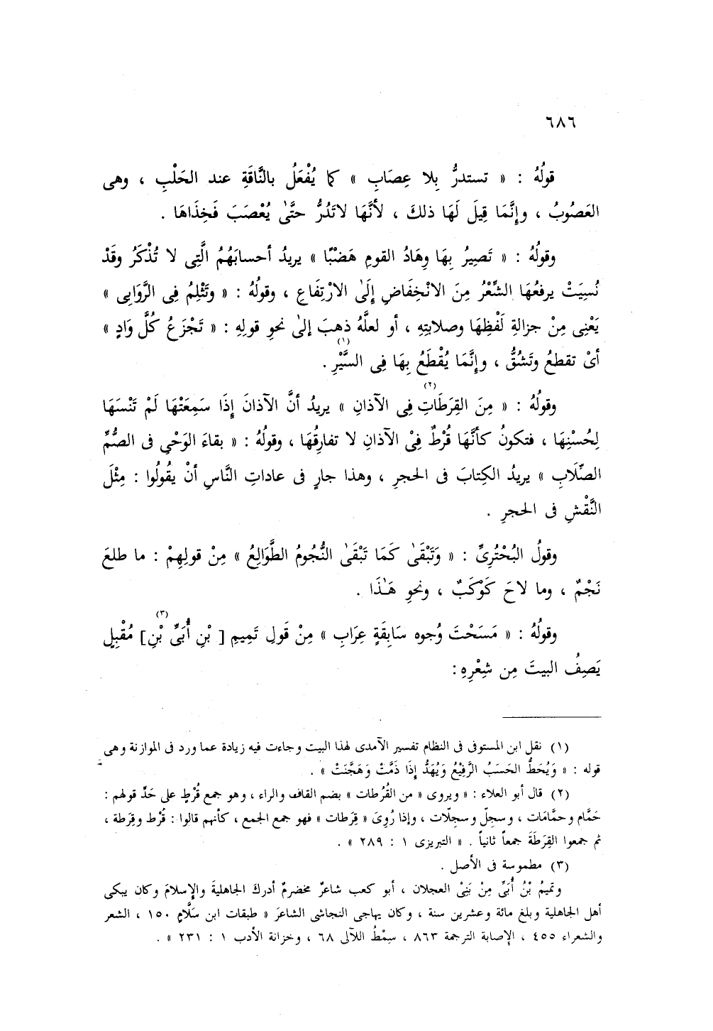 وقوله: «مسحت وجوه سابقة عراب» من قول تميم بن أبي بن مقبل يصف البيت من شعره: