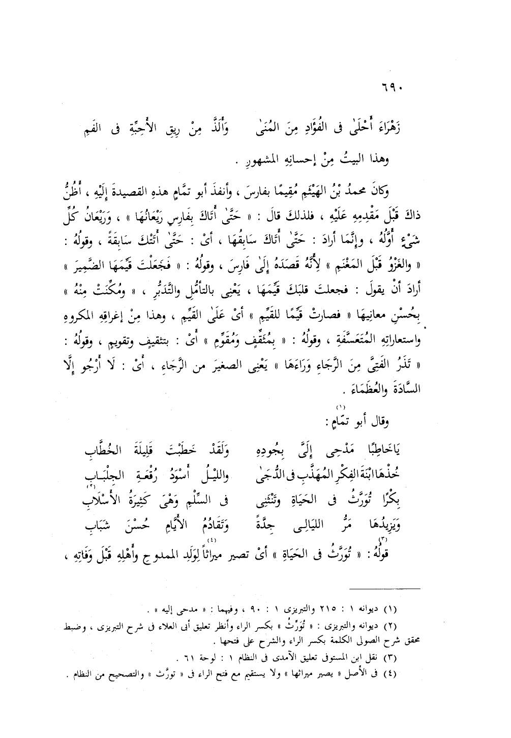 وكان محمد بن الهيثم مقيماً بفارس، وأنفذ أبو تمام هذه القصيدة إليه، أظن ذاك قبل مقدمه عليه، فلذلك قال: «حتى أتاك بفارس ريعانها»، وريعان كل شيء أوله، وإنما أراد: حتى أتاك سابقها، أي: حتى أتتك سابقة، وقوله: «والغزو قبل المغنم» لأنه قصده إلى فارس، وقوله: «فجعلت قيمها الضمير» أراد أن يقول: فجعلت قلبك قيمها، يعني بالتأمل والتدبر، «ومكنت منه» بحسن معانيها «فصارت قيماً للقيم» أي على القيم، وهذا من إغراقه المكروه واستعاراته المتعسفة، وقوله: «بمثقف ومقوم» أي: بتثقيف وتقويم، وقوله: «تذر الفتى من الرجاء وراءها» يعني من الرجاء، أي: لا أرجو إلا السادة والعظماء.
