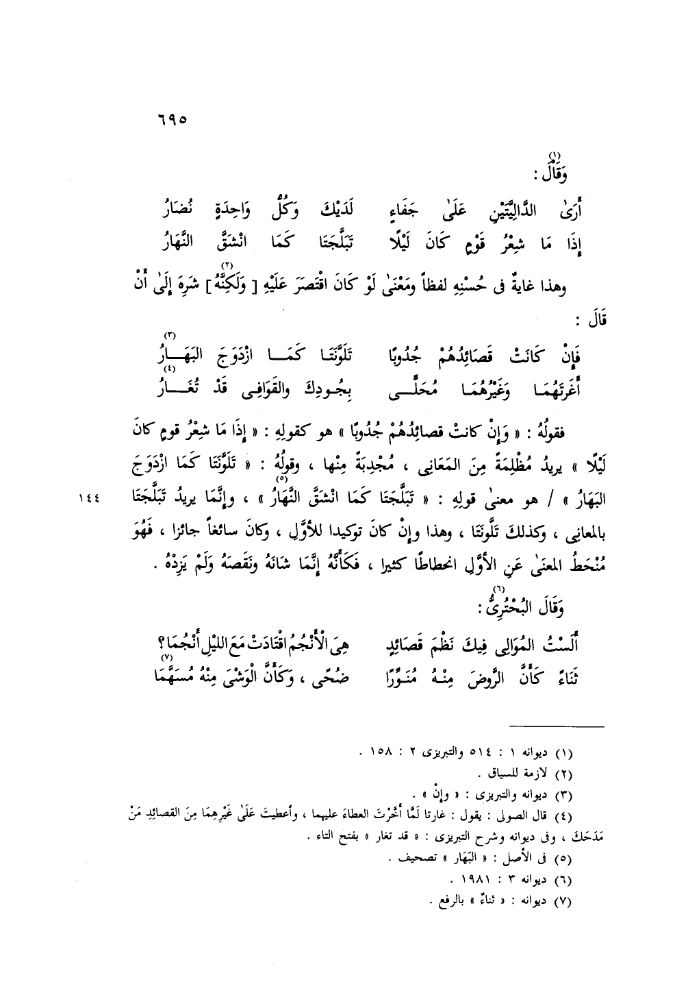فقوله: «وإن كانت قصائدهم جدوباً» هو كقوله: «إذا ما شعر قوم كان ليلاً» يريد مظلمة من المعاني، مجدبة منها، وقوله: «تلونتا كما ازدوج البهار» هو معنى قوله: «تبلجتا كما انشق النهار»، وإنما يريد تبلجتا بالمعاني، وكذلك تلونتا، وهذا وإن كان توكيداً للأول، وكان سائغاً جائزاً، فهو منحط المعنى عن الأول انحطاطًا كثيراً، فكأنه إنما شانه ونقصه ولم يزده.