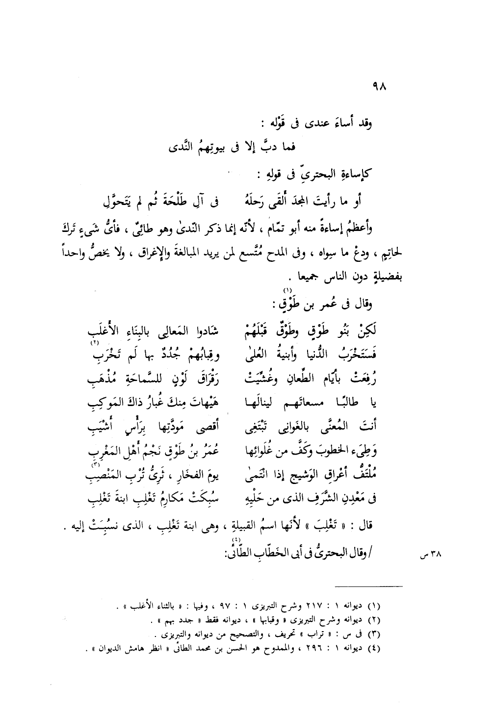 وأعظم إساءة منه أبو تمام، لأنه إنما ذكر الندى وهو طائي، فأي شيء ترك لحاتم، ودع ما سواه، وفي المدح متسع لمن يريد المبالغة والإغراق، ولا يخص واحدًا بفضيلة دون الناس جميعاً.