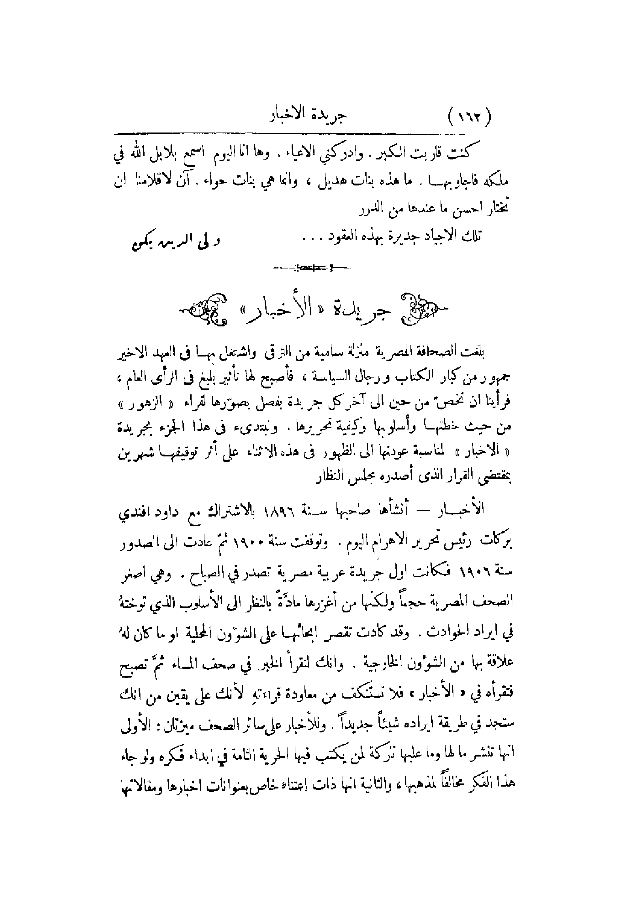بلغت الصحافة المصرية منزلة سامية من الترقي واشتغل بها في العهد الأخير جمهور من كبار الكتاب ورجال السياسة , فأصبح لها تأثير بليغ في الرأي العام , فرأينا أن نخصّ من حين إلى آخر كل جريدة بفصل يصوّرها لقراء الزهور من حيث خطتها وأسلوبها وكيفية تحريرها. ونبتدئ في هذا الجزء بجريدة الأخبار لمناسبة عودتها إلى الظهور في هذه الأثناء على أثر توقيفها شهرين بمقتضى القرار الذي أصدره مجلس النظار