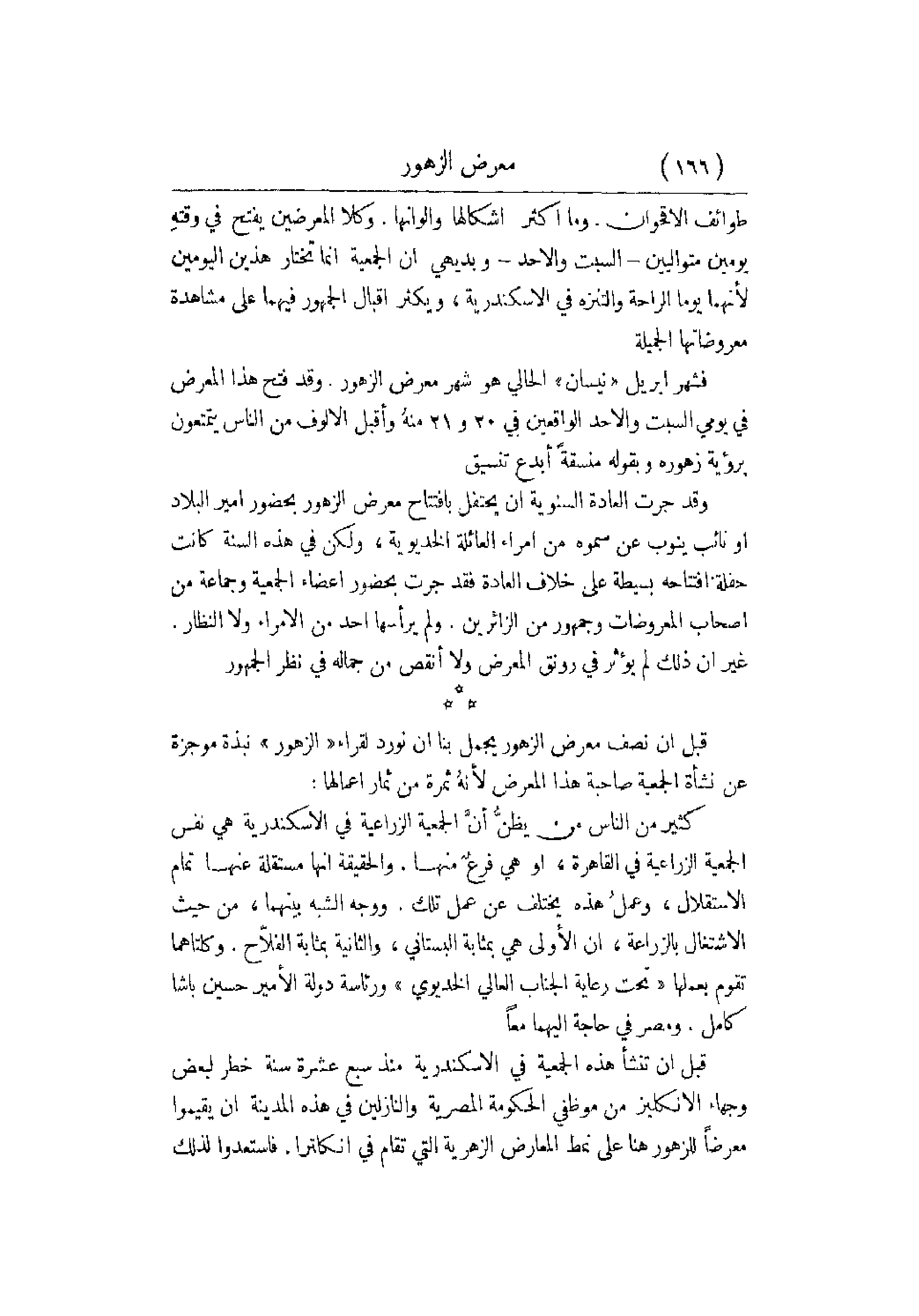 قبل أن نصف معرض الزهور يجمل بنا أن نورد لقراء الزهور نبذة موجزة عن نشأة الجمعية صاحبة هذا المعرض لأنهُ من ثمار أعمالها: كثير من الناس من يظنُّ أنَّ الجمعية الزراعية في الإسكندرية هي نفس الجمعية الزراعية في القاهرة , أو هي فرعٌ منها. والحقيقة أنها مستقلة عنها تمام الاستقلال , وعملُ هذه يختلف عن عمل تلك. ووجه الشبه بينهما , من حيث الاشتغال بالزراعة , أن الأولى هي بمثابة البستاني الفلاّح. وكلتاهما تقوم بعملها تحت رعاية الجناب العالي الخديوي رئاسة دولة الأمير حسين باشا كامل. ومصر في حاجة إليهما معاً قبل أن تنشأ هذه الجمعية في الإسكندرية منذ سبع عشرة سنة خطر لبعض وجهاء الانكليز من موظفي الحكومة المصرية والنازلين في هذه المدينة أن