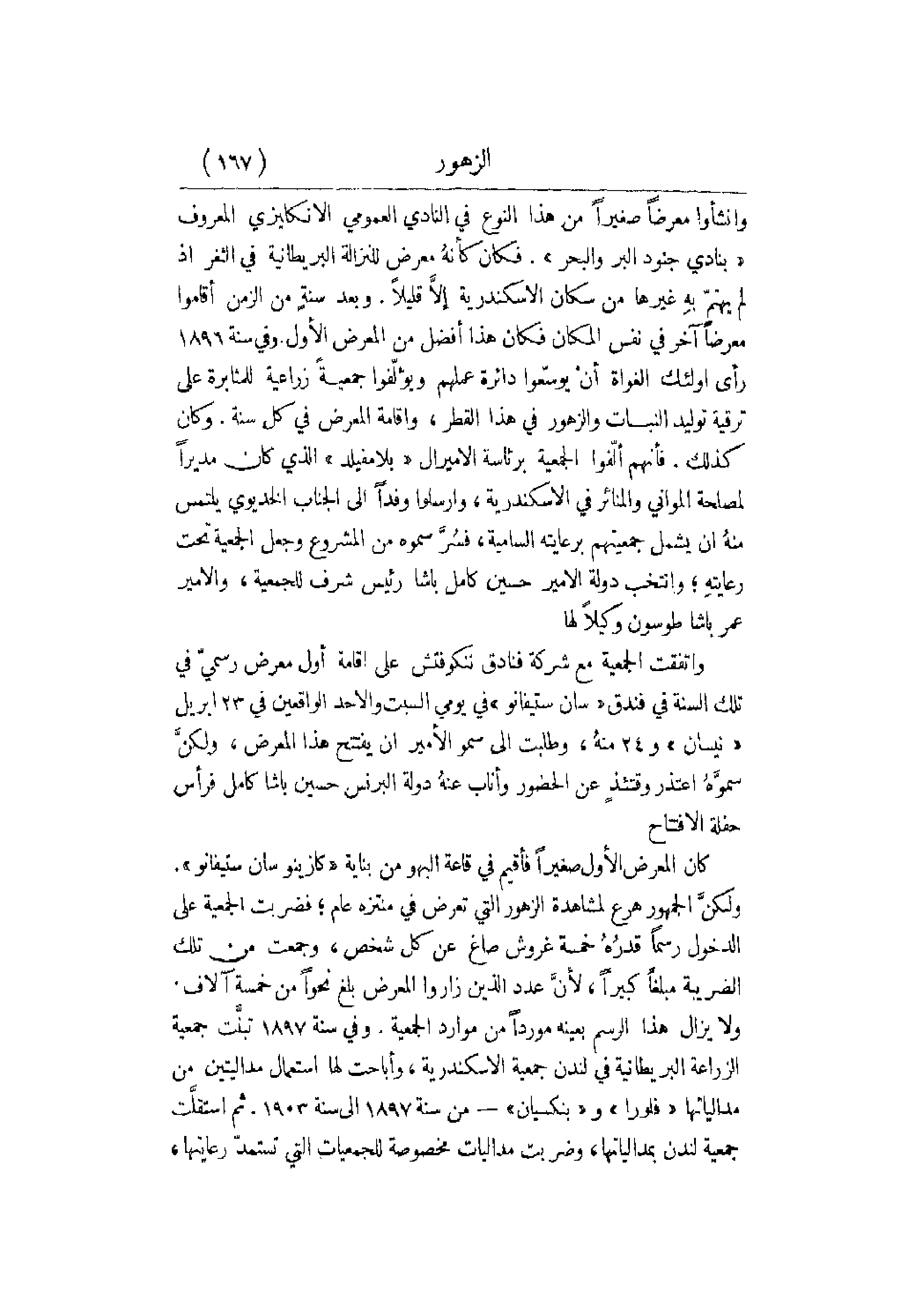 وانشأوا معرضاً صغيراً من هذا النوع في النادي العمومي الانكليزي المعروف بنادي جنود والبحر. فكان كأنهُ معرض للنزالة البريطانية في الثغر إذ لم يهتمّ بهِ غيرها من سكان الإسكندرية إلاَّ قليلاً. وبعد سنةٍ من الزمن أقاموا معرضاً آخر في نفس المكان فكان هذا أفضل من المعرض الأول سنة 1896 رأى أولئك الغواة أن يوسّعوا دائرة عملهم ويؤلّفوا جمعيةً زراعية للمثابرة على ترقية توليد النبات والزهور في هذا القطر , وإقامة المعرض في كل سنة. وكان كذلك. فأنهم ألّفوا الجمعية برئاسة الأميرال بلامفليد الذي كان مديراً لمصلحة المواني والمنائر في الإسكندرية , وأرسلوا إلى الجناب الخديوي يلتمس منهُ أن يشمل جمعيتهم برعاية السامية , فُسرَّ سموه من المشروع وجعل الجمعية تحت رعايتهِ؛ وانتخب دولة الأمير حسين كامل باشا رئيس شرف للجمعية , والأمير عمر باشا طوسون وكيلاً لها واتفقت الجمعية مع شركة فنادق ننكوقتش على إقامة أول معرض رسميّ في تلك السنة في فندق سان ستيفانو في يومي السبت والأحد الواقعين في 223 ابريل نيسان و24 منهُ , وطلبت إلى سمو الأمير أن يفتتح هذا المعرض , ولكنَّ سموَّهُ اعتذر وقتئذٍ عن الحضور وأناب عنهُ دولة البرنس حسين باشا كامل فرأس حفلة الافتتاح كان المعرض الأول صغيراً فأقيم في قاعة البهو من بناية كازينوسان ستيفانو. ولكنَّ الجمهور هرع لمشاهدة الزهور التي تعرض في منتزه عام؛ فضربت الجمعية على الدخول رسماً قدرُهُ خمسة غروش صاغ عن كل شخص , وجمعت من تلك الضريبة مبلغاً كبيراً , لأنَّ عدد الذين زاروا المعرض بلغ نحواً من خمسة آلاف. ولا يزال هذا الرسم بعينه مورداً من موارد الجمعية. وفي سنة 1897 تبنَّت جمعية الزراعة البريطانية في لندن جمعية الإسكندرية , وأباحت لها استعمال مداليتيتن من مدالياتها فلورا وبنكسيان - من سنة 1897 إلى سنة 1903. ثم استقلَّت جمعية لندن بمدالياتها , وضربت مداليات مخصوصة للجمعيات التي تستمدّ رعايتها ,