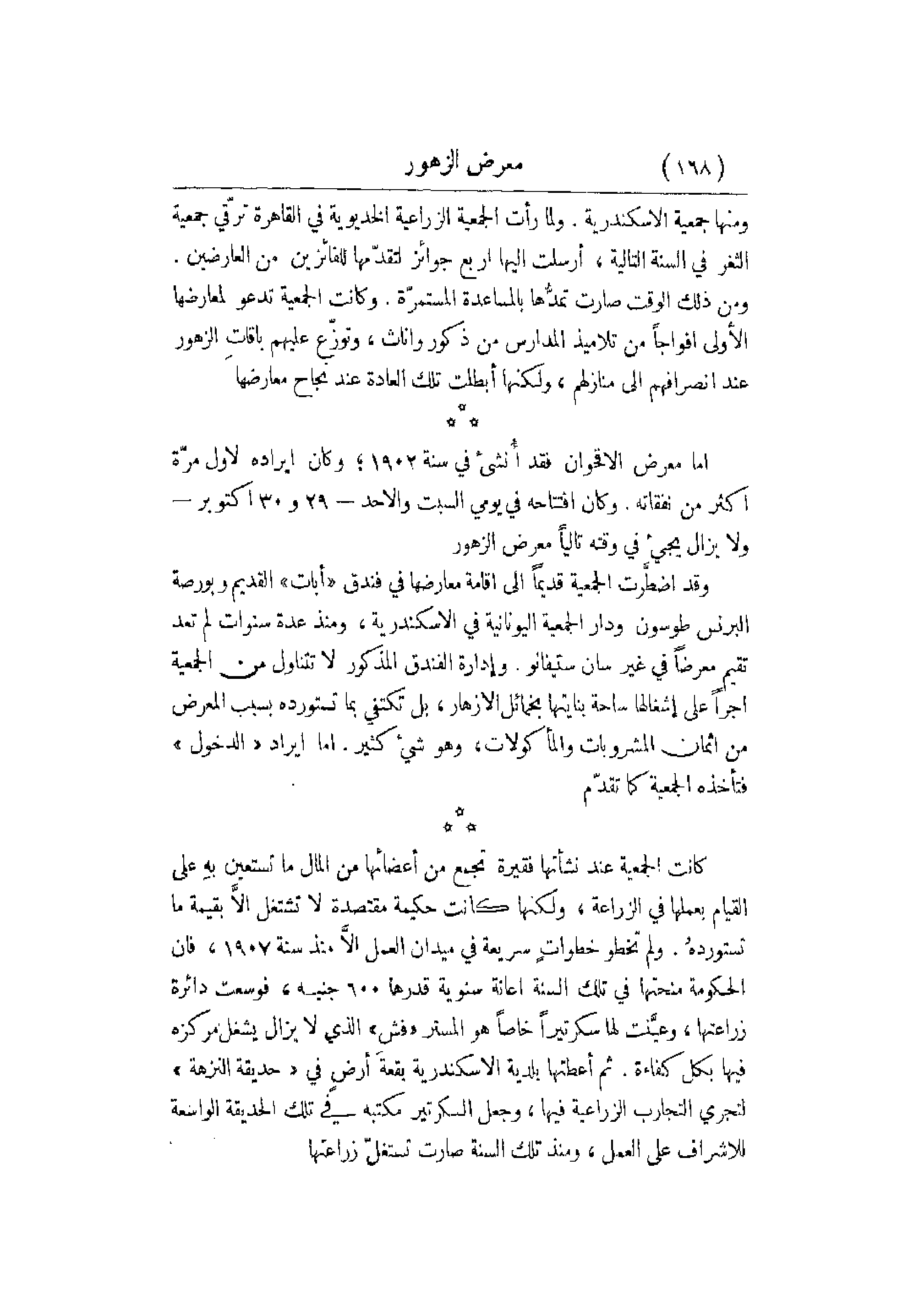 ومنها جمعية الإسكندرية. ولما رأت الجمعية الزراعية الخديوية في القاهرة ترّقي جمعية الثغر في السنة التالية , أرسلت إليها أربع جوائز لتقدّمها للفائزين من العارضين. ومن ذلك الوقت صارت تمدُّها بالمساعدة المستمرّة. وكانت الجمعية تدعو لمعارضها الأولى أفواجاً من تلاميذ المدارس من ذكور وإناث , وتوزّع