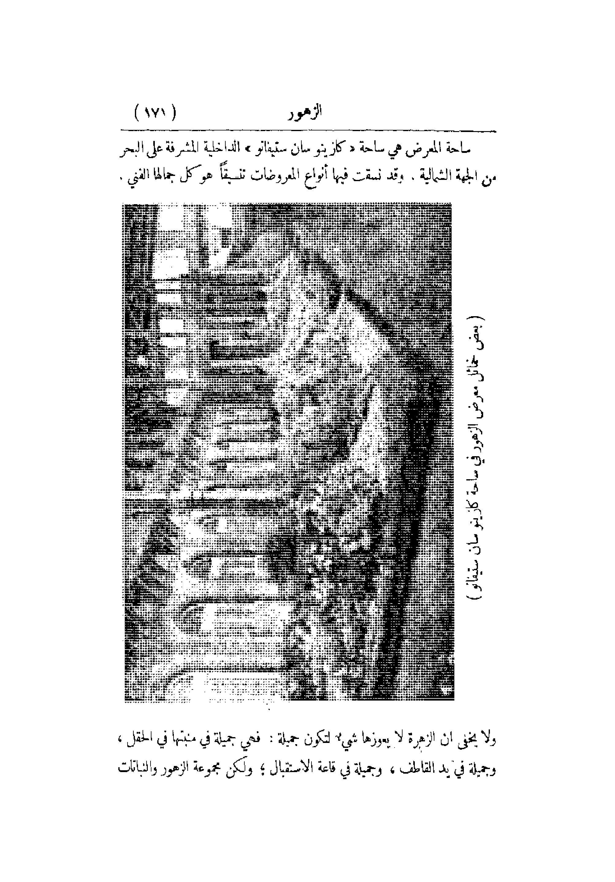 ساحة المعرض هي ساحة كازينوسان ستيفانو الداخلية المشرفة على البحر من الجهة الشمالية. وقد نسفت فيها أنواع المعروضات تنسيقاً هو كل جمالها الفني ولا يخفى أن الزهرة لا يعوزها شيٌ لتكون جميل: فهي جميلة في منبتها في الحق , وجميلة في يد القاطف , وجميلة في قاعة الاستقبال؛ ولكن مجموعة الزهور والنباتات