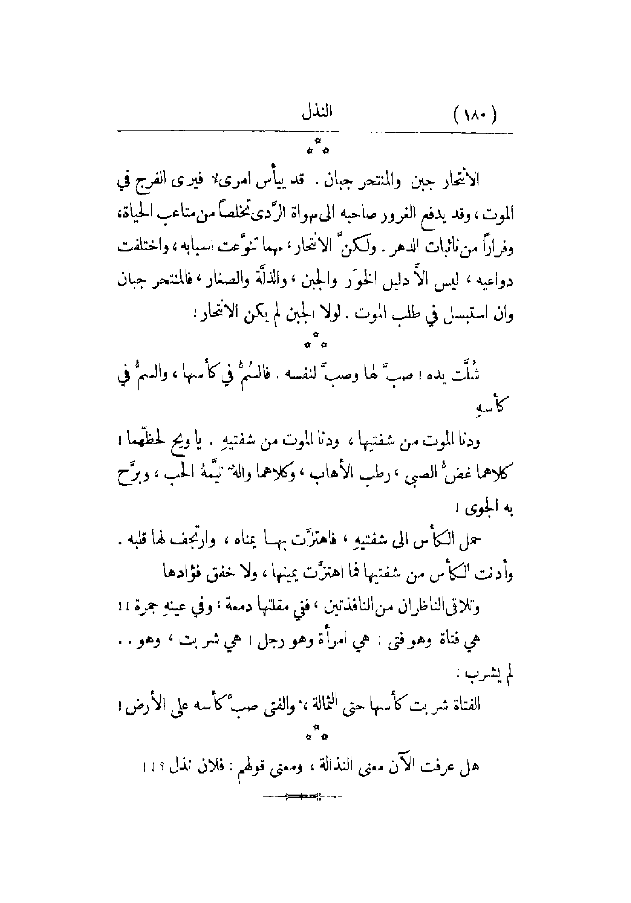 الانتحار جبن والمنتحر جبان قد ييأس امرئٌ فيرى الفرج في الموت , وقد يدفع صاحبه إلى مهواة الرَّدى تخلصاً من متاعب الحياة , وفراراً من نائبات الدهر. ولكنَّ الانتحار , مهما تنوَّعت أسبابه , واختلفت دواعيه , ليس إلاَّ دليل الخوَر والجبن , والذلَّة والصغار , فالمنتحر جباز وإن استبسل في طلب الموت. لولا الجبن لم يكن الانتحار!
