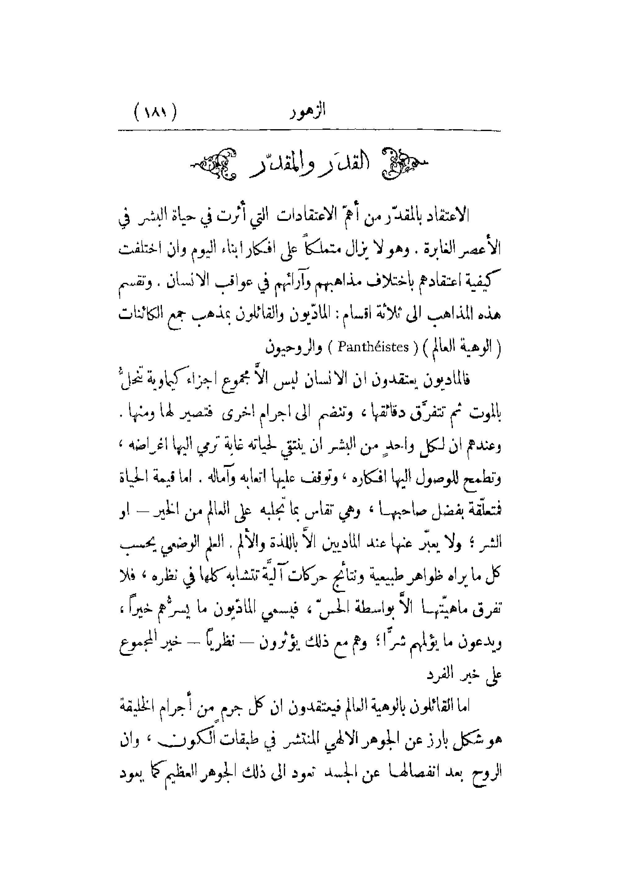 الاعتقاد بالمقدّر من أهمّ الاعتقادات التي أثرت في حياة البشر في الأعصر الغابرة. وهو لا يزال متملكاً على أفكار أبناء اليوم وأن اختلفت كيفية اعتقادهم باختلاف مذاهبهم وآرائهم في عواقب الإنسان. وتقسم هذه المذاهب إلى ثلاثة أقسام: المادّيون والقائلون بمذهب جمع الكائنات (الوهية العالم)