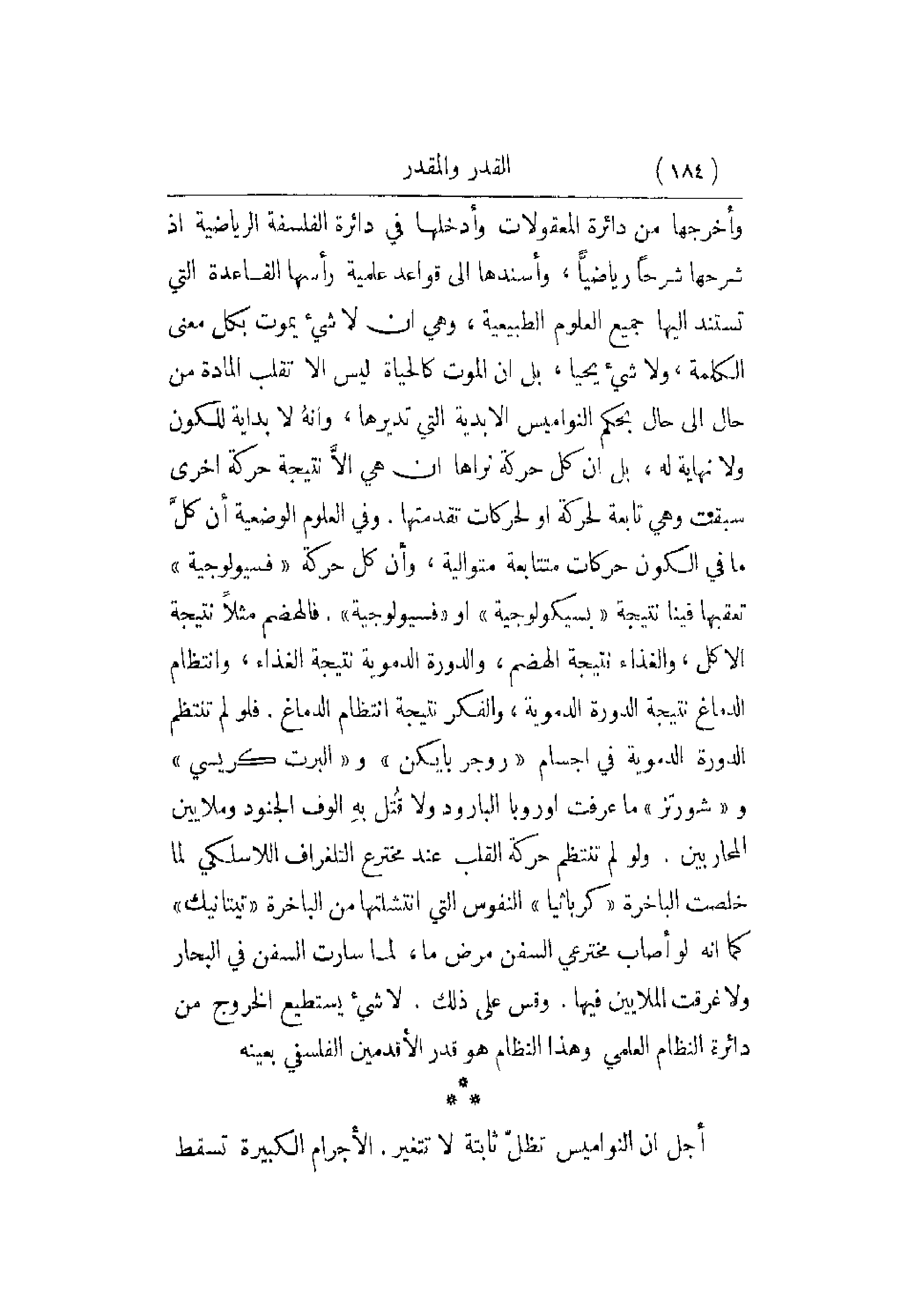 الدموية في أجسام روجربايكن والبرت كريسي وشورتز ما عرفت أوروبا البارود ولا قُتل بهِ الوف الجنود وملايين المحاربين. ولو لم تنتظم حركة القلب عند مخترع التلغراف اللاسلكي لما خلصت الباخرة كرباثيا النفوس التي انتشلتها من الباخرة تيتانيك كما أنه لو أصاب مخترعي السفن مرض ما , لما سارت السفن في البحار ولا غرقت الملايين فيها. وقس على ذلك. لاشيء يستطيع الخروج من دائرة النظام العلمي وهذا النظام هو قدر الأقدمين الفلسفي بعينه