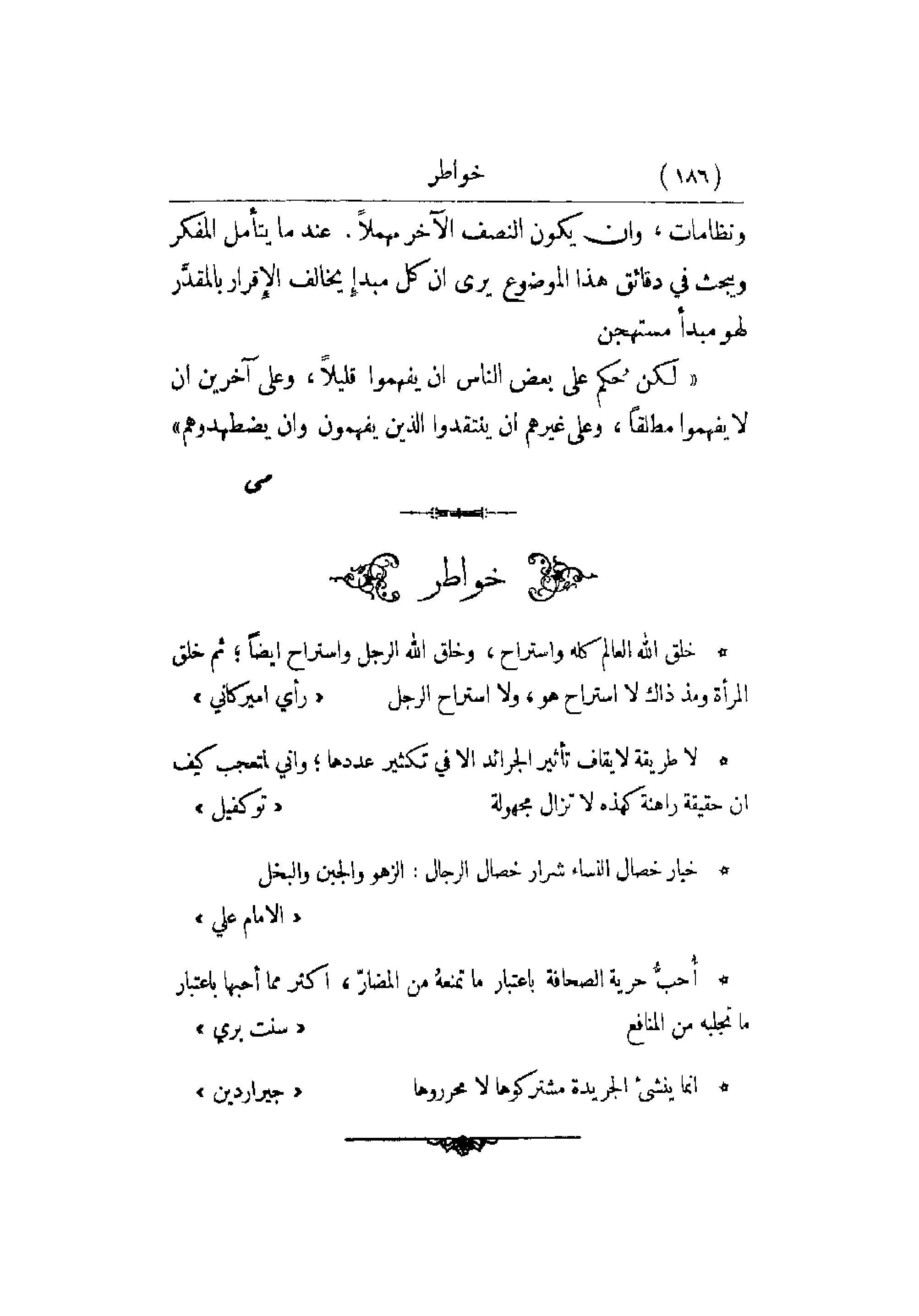 ونظامات , وأن يكون النصف الآخر مهملاً. عند ما يتأمل المفكر ويبحث في دقايق هذا الموضوع يرى أن كل مبدأِ يخالف الإِقرار بالمقدَّر لهو مبدأ مستهجن لكن حُكم على بعض الناس أن يفهموا قليلاً , وعلى آخرين أن لا يفهموا مطلقاً , وعلى غيرهم أن ينتقدوا الذين يفهمون وأن يضطهدوهم