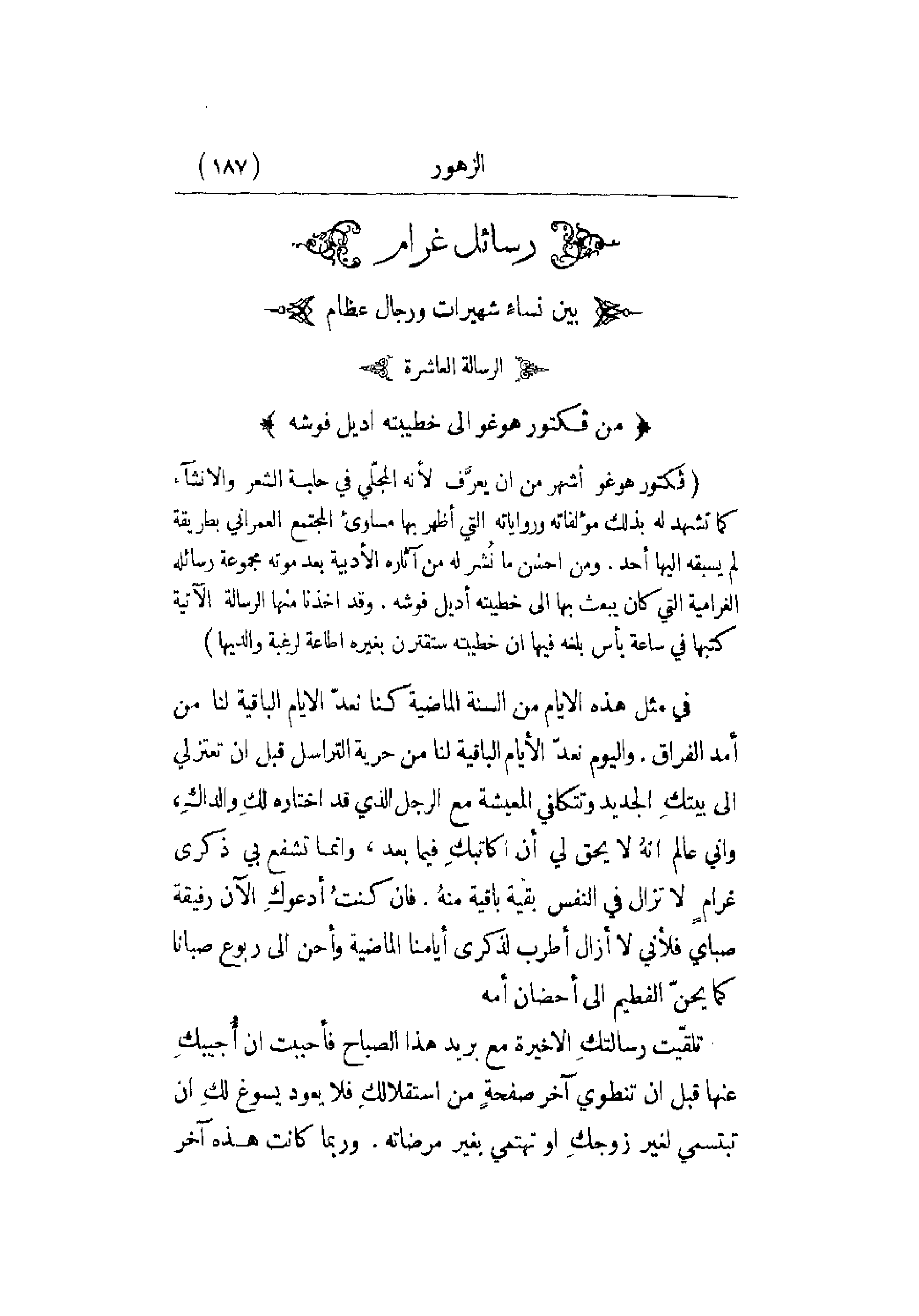 فكتور هوغو أشهر من أن يعرَّف لأنه المجّلي في حلبة الشعر والإنشاء كما تشهد له بذلك مؤلفاته ورواياته التي بها مساوئ المجتمع العمراني بطريقة لم يسبقه إليها أحد. ومن أحسن ما نُشر له من آثاره الأدبية بعد موته مجموعة رسائله الغرامية التي كان يبعث بها إلى خطيبته أديل فوشه. وقد أخذنا منها الرسالة الآتية كتبها في ساعة يأس بلغه أن خطيبته ستقترن بغيره إطاعة لرغبة والديها في مثل هذه الأيام من السنة الماضية كنا نعدّ الأيام الباقية لنا من أمد الفراق. واليوم نعدّ الأيام الباقية لنا من حرية التراسل قبل أن تعتزلي إلى بيتكِ الجديد وتتكلفي المعيشة مع الرجل الذي قد اختاره لكِ والداكِ , وأني عالم أنهُ لا يحق لي أن أكاتبك فيما بعد , وإنما تشفع بي ذكرى غرامٍ لا تزال في النفس بقية باقية منهُ. فإن كنتُ أدعوكِ الآن رفيقة صباي فلأني لا أزال أُطرب لذكرى أيامنا الماضية وأحن إلى ربوع صبانا كما يحنّ الفطيم إلى أحصان أمه تلقّيت رسالتكِ الأخيرة مع بريد هذا الصباح فأحببت أن أُجيبكِ عنها قبل أن تنطوي آخر صفحةٍ من استقلالكِ فلا يعود يسوغ لكِ أن تبتسمي لغير زوجكِ أو تهتمي بغير مرضاته. وربما كانت هذه آخر