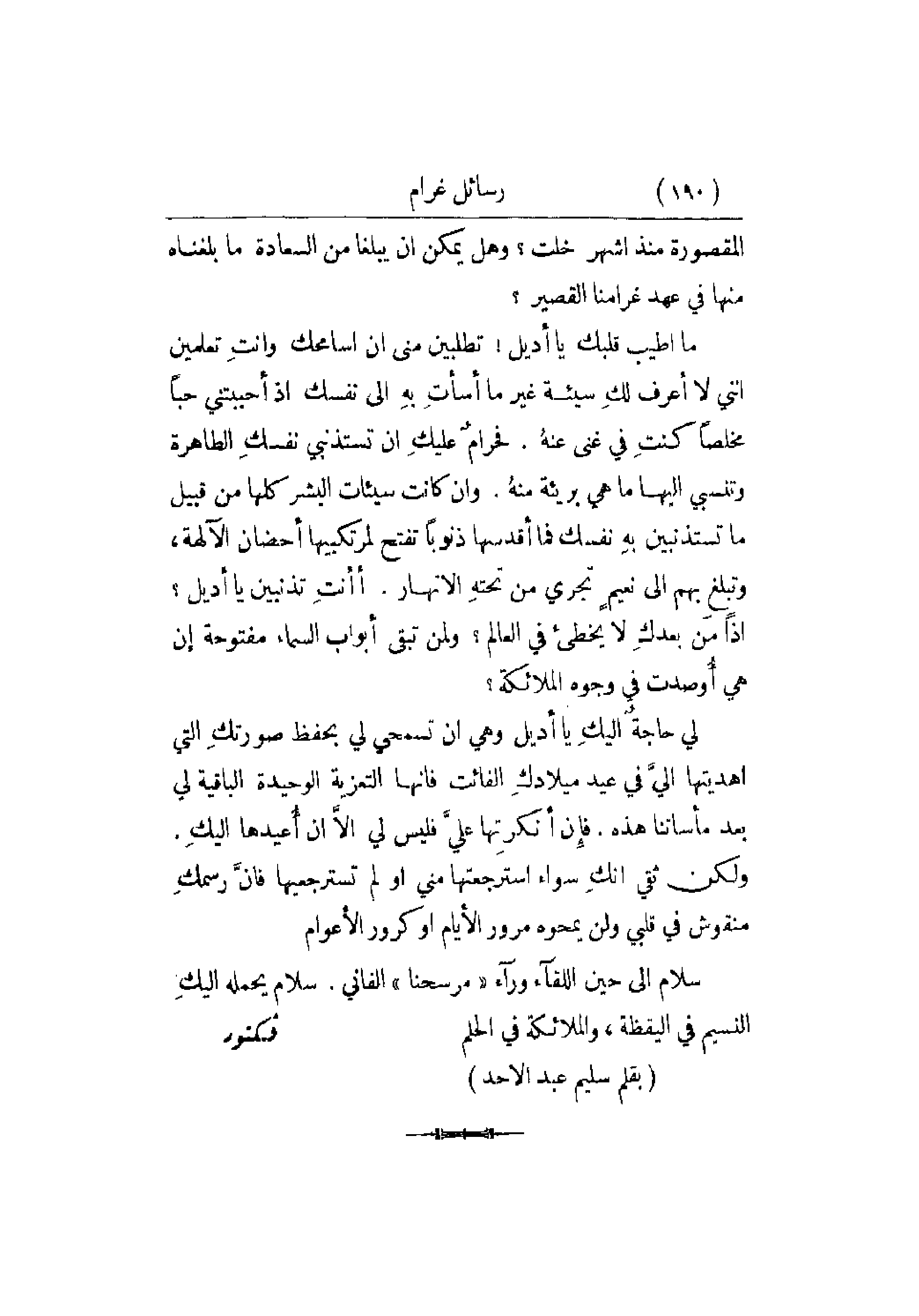 تفتح لمرتكبيها أحضان الآلهة , وتبلغ بهم إلى نعيم تجري من تحتهِ الأنهار. أأنتِ تذنبين يا أديل؟ إذاً من بعدك لا يخطئ في العالم؟ ولمن تبقى أبواب السماء مفتوحة إن هي أُوصدت في وجوه الملائكة؟ لي حاجةٌ إليكِ يا أديل وهي أن تسمحي لي بحفظ صورتك التي أهديتها إليَّ في عيد ميلادكِ الفائت فإنها التعزية الوحيدة الباقية لي بعد مأساتنا هذه. فإِن أنكرتها عليَّ فليس لي إلاَّ أن أُعيدها إليكِ. ولكن ثقي أنك سواء استرجعتها مني أو لم تسترجعيها فإنَّ رسمكِ منقوش في قلبي ولن يمحوه مرور الأيام أو كرور الأعوام. سلام إلى حين اللقاء وراء مرسحنا الفاني. سلام يحمله إليكِ النسيم في اليقظة , والملائكة في الحلم