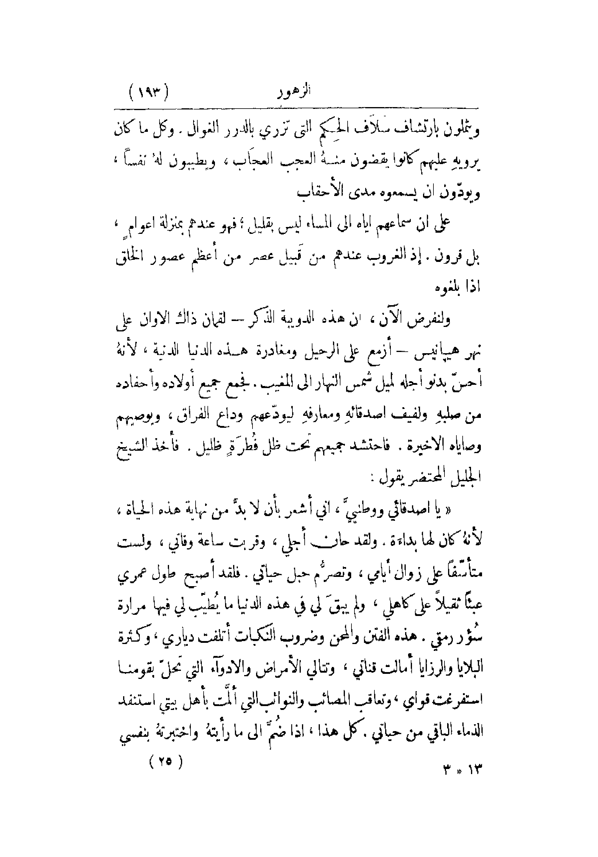 العجب العجَاب , ويطيبون لهُ نفساً , ويودّون أن يسمعوه مدى الأحقاب على أن سماعهم إياه إلى المساء ليس بقليل؛ فهو عندهم بمنزلة أعوامٍ , بل قرون. إذ الغروب عندهم من قَبيل عصر من أعظم عصور الخلق إذا بلغوه. ولنفرض الآن , إن هذه الدويبة الذكر - لقمان ذاك الأوان على نهر هيبانيس - أزمع على الرحيل ومغادرة هذه الدنيا الدنية , لأنهُ أحسّ بدنو أجله لميل شمس النهار إلى المغيب. فجمع جميع أولاده وأحفاده من صلبهِ ولفيف أصدقائهِ ومعارفهِ ليودّعهم وداع الفراق , ويوصيهم وصايا الأخيرة. فاحتشد جميعهم تحت ظل فُطرَةٍ ظليل. فأخذ الشيخ الجليل المحتضر يقول: يا أصدقائي ووطنييَّ , إني أشعر بأن لا بدَّ من نهاية هذه الحياة , لأنهُ كان لها بداءَة. ولقد حان أجلي , وقربت ساعة وفاتي , ولست متأسّفاً على زوال أيامي , وتصرُّم حبل حياتي. فلقد أصبح طول عمري عبئاً ثقيلاً على كاهلي , ولم يبقَ لي في هذه الدنيا ما يُطيّب لي فيها مرارة سُؤر رمقي. هذه الفتن والمحن وضروب النكبات أتلفت دياري , وكثرة البلايا والرزايا أمالت قناتي , وتتالي الأمراض والأدواء التي تحلّ بقومنا استفرغت قواي , وتعاقب المصائب والنوائب التي ألمَّت بأهل بيتي استنفد الدماء الباقي من حياتي. كل هذا , إذا ضُمَّ إلى ما رأيتهُ واختبرتهُ بنفسي