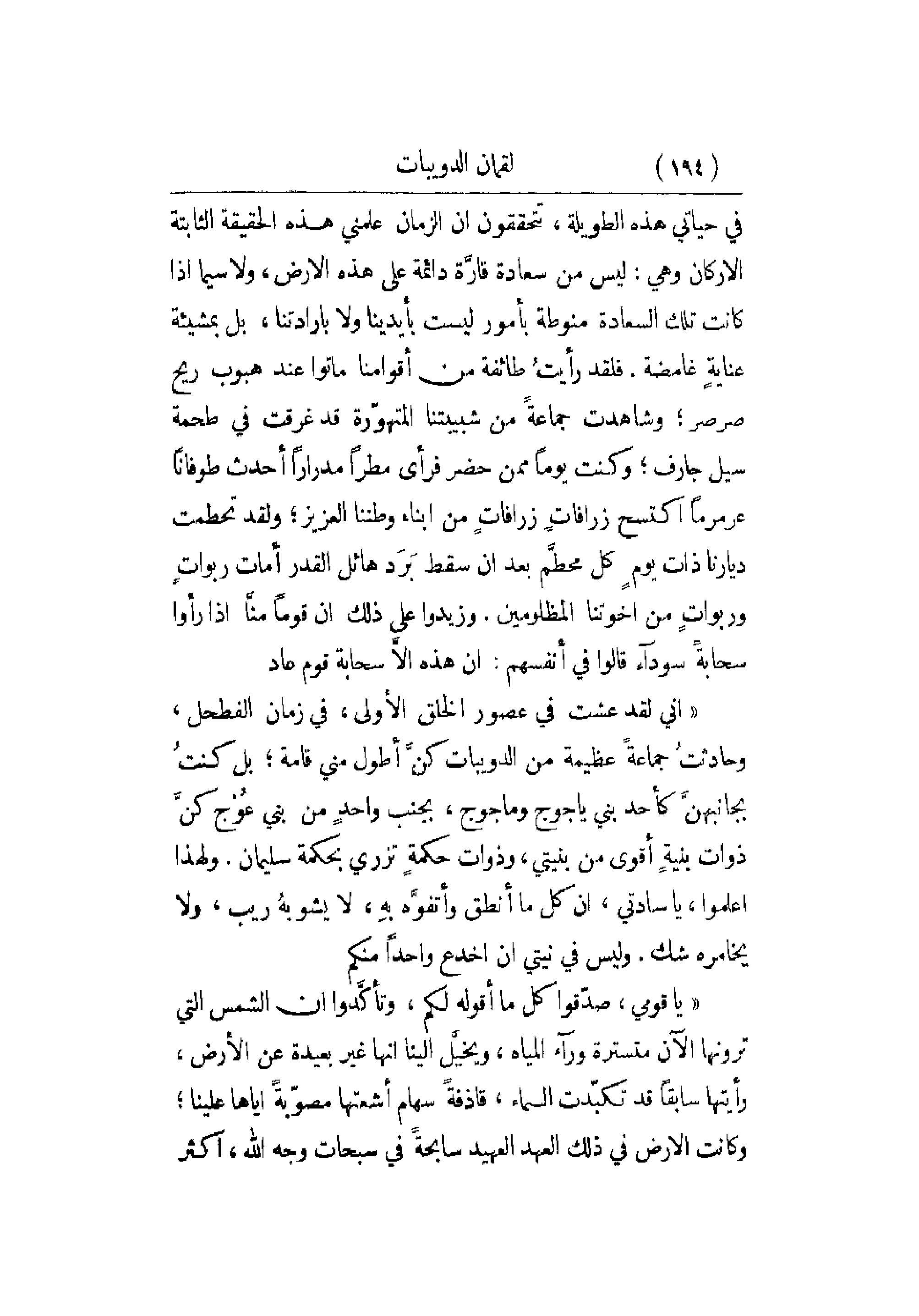 في حياتي هذه الطويلة , تتحققون أن الزمان علمني هذه الحقيقة الثابتة الأركان وهي: ليس قارَّة دائمة على هذه الأرض ولا بإرادتنا , ولاسيما إذا كانت تلك السعادة منوطة بأمور ليست بأيدينا ولا بإرادتنا , بل بمشيئة عنايةٍ غامضة. فلقد رأيتُ طائفة من أقوامنا ماتوا عند هبوب ريح صرصر؛ وشاهدت جماعةً من شبيبتنا المتهوّرة قد غرقت في طحمة سيل جارف؛ وكنت يوماً ممن حضر فرأى مطراً مدراراً أحث طوفاناً عرمرماً اكتسح زرافات زرافت من أبناء وطننا العزيز؛ ولقد تحطمت ديارنا ذات يومٍ كل محطَّم بعد أن سقط بَرَد هائل القدر أمات ربواتٍ وربواتٍ من أخوتنا المظلومين. وزيدوا على ذلك أن قوماً منَّا إذا رأوا سحابةً سوداء قالوا في أنفسهم: إن هذه إلاَّ سحابة قوم عاد إني لقد عشَت في عصور الخلق الأولى , في زمان الفطحل؛ وحادثتُ جماعةً عظيمة من الدويبات كنَّ أطول مني قامة؛ بل كنتُ بجانبهنَّ كأحد بني ياجوج وماجوج , بجنب واحدٍ من بني عُوْج كنَّ ذوات بنيةٍ أقوى من بنيتي , وذوات حكمةٍ تزري بحكمة سليمان. ولهذا اعلموا , يا سادتي , إن كل ما أنطق وأتفوَّه بهِ , لا يشوبهُ ريب , ولا يخامره شك. وليس