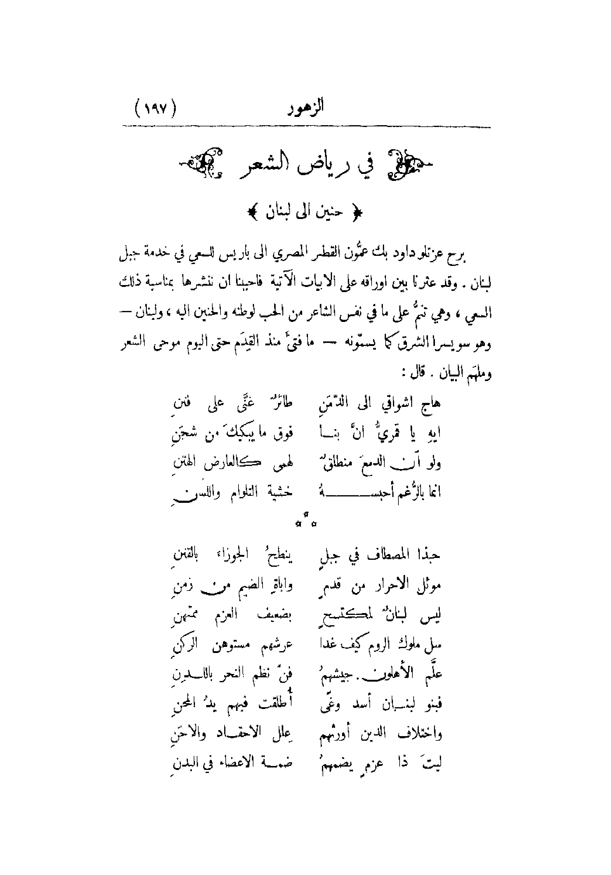 برح عزتلو داود بك عمُّون القطر المصري إلى باريس للسعي في خدمة جبل لبنان. وقد عثرنا بين أوراقه على الأبيات الآتية فأحببنا أن ننشرها بمناسبة ذلك السعي , وهي تنمُّ على ما في نفس الشاعر من الحب لوطنه والحنين إليه , ولبنان - وهو سويسرا الشرق كما يسمّونه - ما فتئَ منذ القِدَم حتى اليوم موحى الشعر وملهَم البيان. قال: