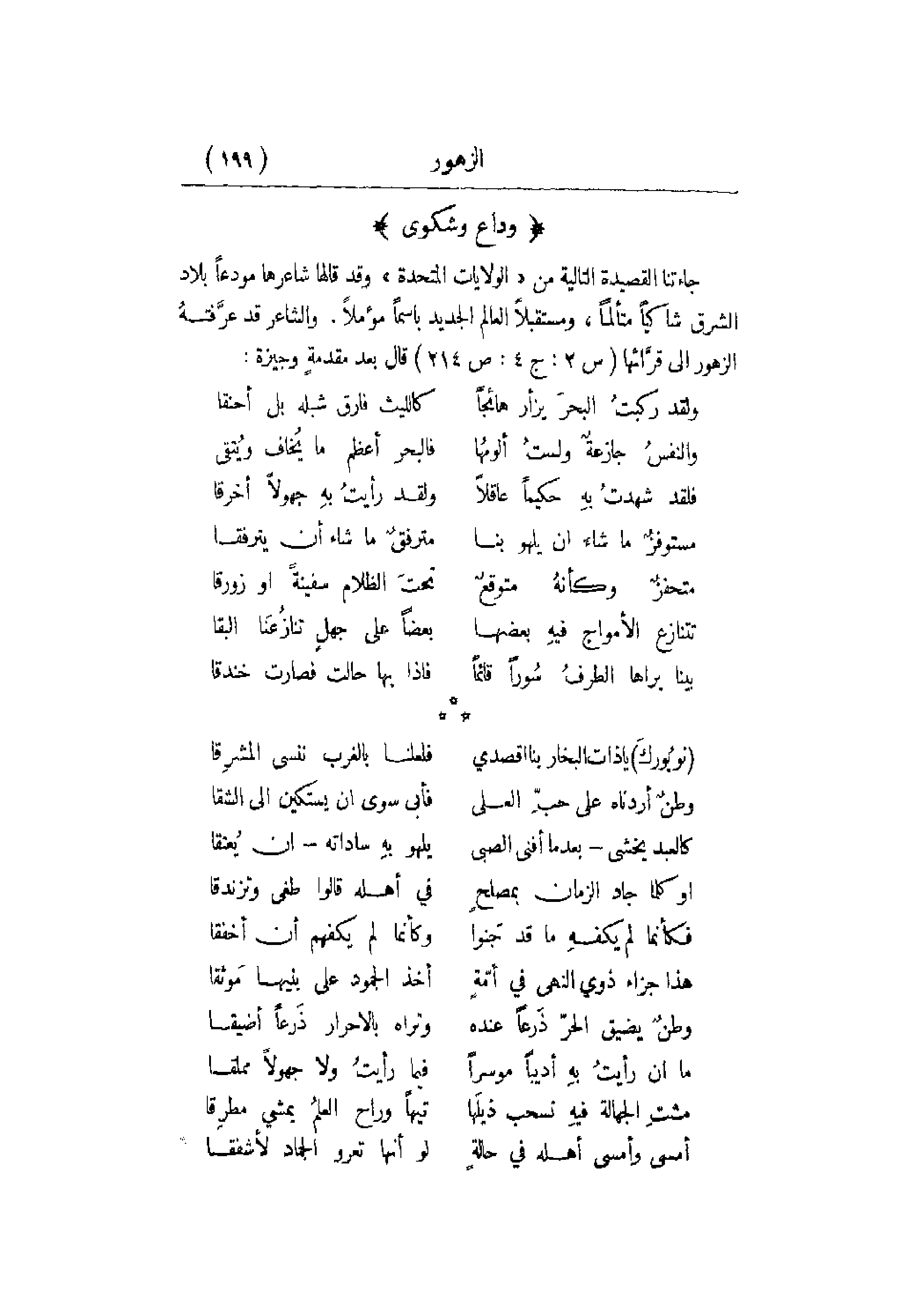جاءتنا القصيدة التالية من الولايات المتحدة وقد قالها شاعرها مودعاً بلاد الشرق شاكياً متألماً , ومستقبلاً العالم الجديد باسماً مؤملاً. والشاعر قد عرَّفتهُ الزهور إلى قرَّائها (س2: ج4: ص214) قال بعد مقدمةٍ وجيزة: