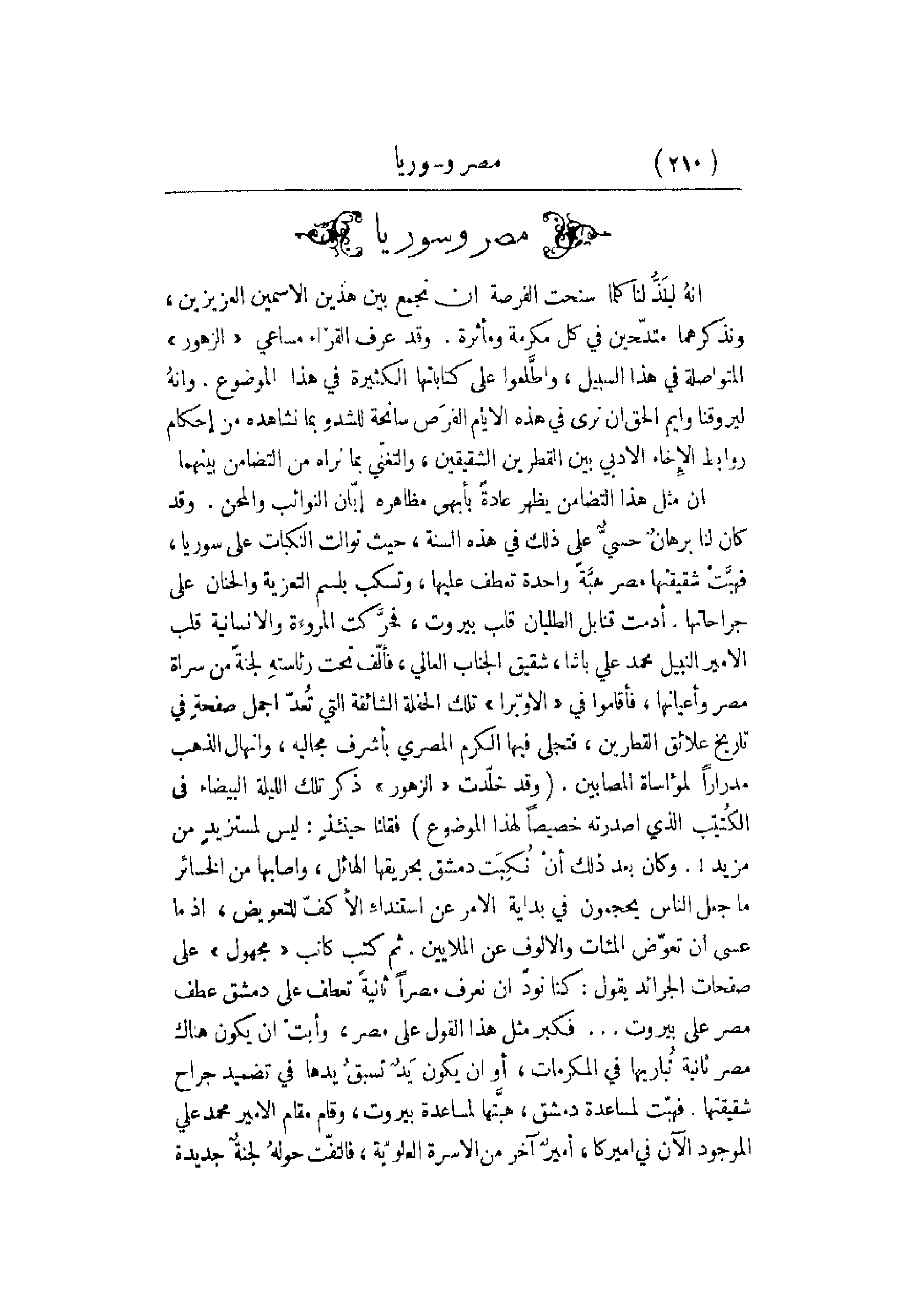 إنهُ ليلَذُّ لنا كلما سنحت الفرصة أن نجمع بين هذين الاسمين العزيزين , ونذكرهما متدّحين في كل مكرمة ومأثرة. وقد عرف القراء مساعي الزهور المتواصلة في هذا السبيل , واطَّلعوا على كتابتها الكثيرة في هذا الموضوع. وإنهُ ليروقنا وإيم الحق أن نرى في هذه الأيام الفرَص سانحة للشدو بما نشاهدها من إحكام روابط الإِخاء الأدبي بين القطرين الشقيقين , والتغنّي بما نراه من التضامن بينهما. إن مثل هذا التضامن يظهر عادة بأبهى مظاهره إبّان النوائب والمحن. وقد كان لنا برهانٌ حسبيٌّ على ذلك في هذه السنة , حيث توالت النكبات على سوريا , فهبَّتْ شقيقتها مصر هبّةً واحدة تعطف عليها , وتسكب بلسم التعزية والحنان على جراحاتها. أدمت قنابل الطليان قلب بيروت , فحرّكت المروءة والإنسانية قلب الأمير النبيل محمد علي باشا , شقيق الجناب العالي , فألّف تحت رئاستهِ لجنةً من سراة مصر وأعيانها , فأقاموا في الأوبّرا تلك الحفلة الشائقة التي تُعدّ أجمل صفحةٍ في تاريخ علائق القطرين , فتجلى فيها الكرم المصري بأشرف مجاليه , وإنهال الذهب مدراراً لمؤساة المصابين. وقد خلّدت الزهور ذكر تلك الليلة البيضاء في الكُتيّب الذي أصدرته خصيصاً لهذا الموضوع فقلنا حينئذٍ: ليس لمستزيدٍ من مزيد!. وكان بعد ذلك أن نُكِبَت دمشق بحريقها الهائل , وأصابها من الخسائر ما جعل الناس يحجمون في بداية الأمر عن استنداء الأكفّ للتعويض , إذ ما عسى أن تعوّض المئات والألوف عن الملايين. ثم كتب كاتب مجهول على صفحات الجرائد يقول: كنا نودّ أن نعرف مصراً ثانية تعطف على دمشق عطف مصر على بيروت. . . فكبر مثل هذا القول على مصر , وأبتْ أن يكون هتاك مصر ثانية تُباريها في المكرمات , أو أن يكون يَدٌ تسبقُ يدها في تضميد جراح شقيقتها فهبّت لمساعدة دمشق , هبَّتها لمساعدة بيروت , وقام مقام الأمير محمد علي الموجود الآن في أميركا , أميرُ آخر من الأسرة العلويّة , فالتفّت حولهُ لجنةٌ جديدة
