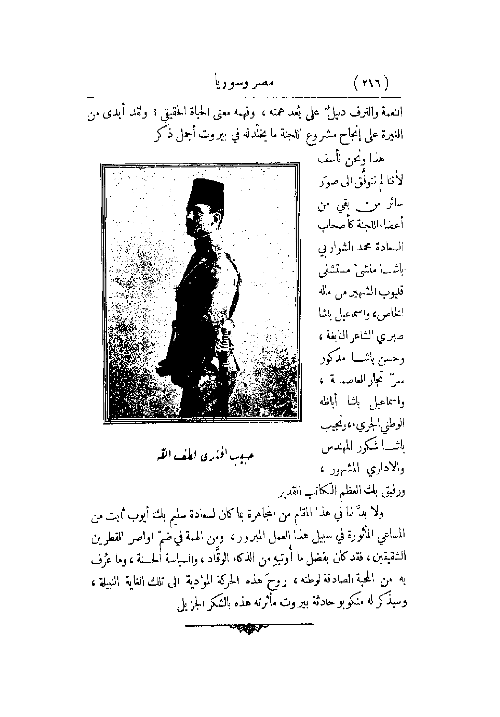 النعمة والترف على بُعد همته , وفهمه معنى الحياة الحقيقي؟ ولقد أبدى من الغيرة على إنجاح مشروع اللجنة ما يخلّد له في بيروت أجل ذكر هذا ونحن نأسف لأننا لم ننوفَّق إلى صوَر سائر من بقي من أعضاء اللجنة كأصحاب السعادة محمد الشواربي باشا منشئ مستشفى قليوب الشهير من ماله الخاص , وإسماعيل باشا صبري الشاعر النابغة , وحسن باشا مدكور سرّ تجار العاصمة , وإسماعيل باشا أباظة الوطني الجريء , ونجيب باشا شكور المهندس والإداري المشهور , ورفيق بك العظم الكاتب القدير ولابدَّ لنا في هذا المقام من المجاهرة بما كان لسعادة سليم بك أيوب ثابت من المساعي المأثورة في سبيل هذا العمل المبرور , ومن الهمة في ضمّ أواصر القطرين الشقيقين , فقد كان بفضل ما أُوتيهِ من الذكاء الوقَّاد , والسياسة الحسنة , وما عُرف به من المحبة الصادقة لوطنه , روحَ هذه الحركة المؤدية إلى تلك الغاية النبيلة , وسيذكر له منكوبو حادثة بيروت مأثرته هذه بالشكر الجزيل.