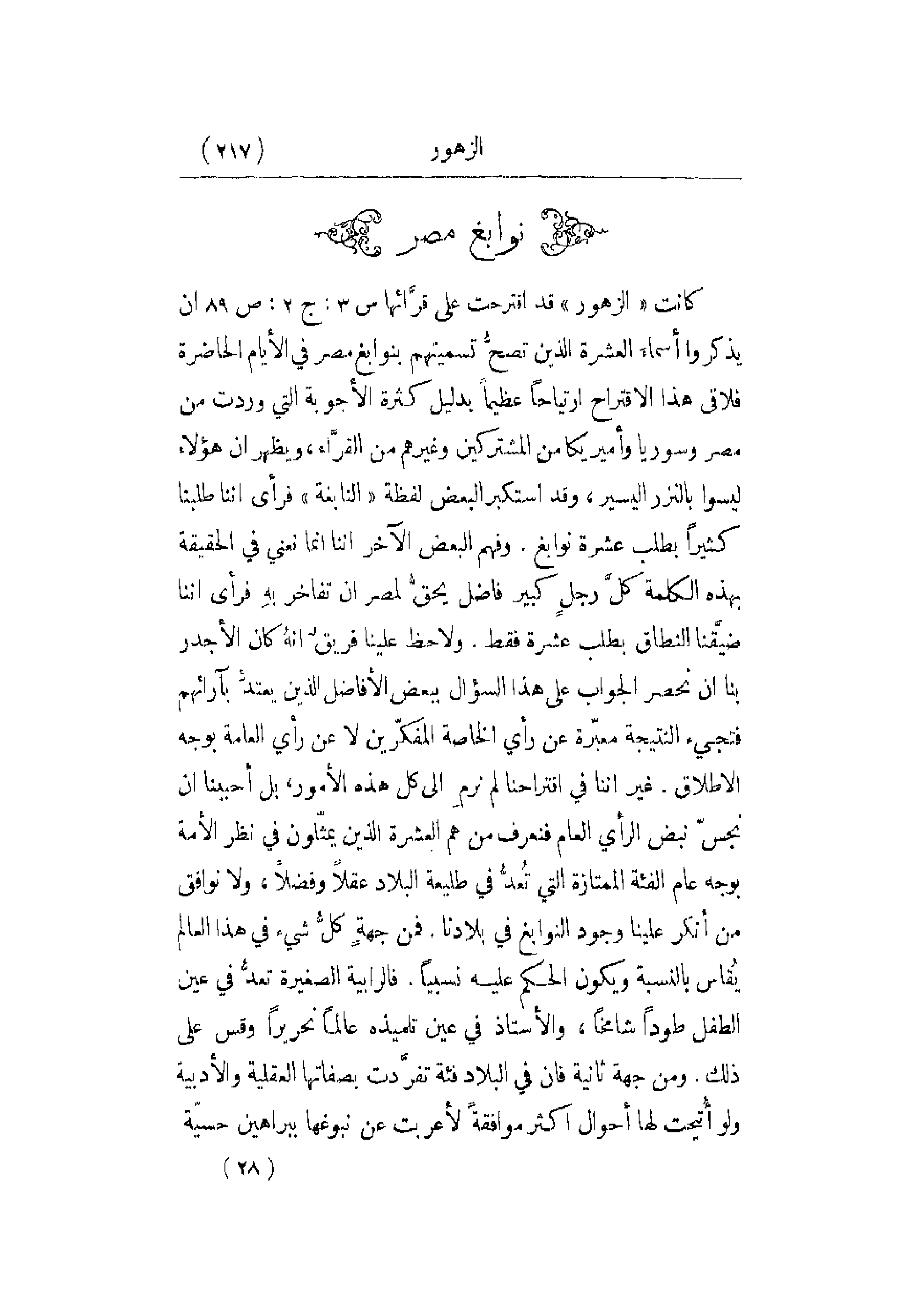 كانت الزهور قد اقترحت على قرَّائها س3: ج2: ص89 أن يذكروا أسماءَ العشرة الذين تصحُّ تسميتهم بنوابغ مصر في الأيام الحاضرة فلاقى هذا الاقتراح ارتياحاً عظيماً بدليل كثرة الأجوبة التي وردت من مصر وسوريا وأميريكا من المشتركين وغيرهم من القرَّاء , ويظهر أن هؤلاء ليسوا بالنزر واليسير , وقد استكبر البعض لفظة النابغة فرأى أننا طلبنا كثيراً بطلب عشرة نوابغ. وفهم البعض الآخر أننا إنما نعني في الحقيقة بهذه الكلمة كلَّ رجلٍ كبير فاضل يحقُّ لمصر أن تفاخر بهِ فرأى أننا ضيَّقنا النطاق بطلب عشرة فقط. ولاحظ علينا فريقٌ أنهُ كان الأجدر بنا أن نحصر الجواب على هذا السؤال ببعض الأفاضل الذين يعتدُّ بآرائهم فتجيء النتيجة معبّرة عن رأي الخاصة المفكّرين لا عن رأي العامة وجه الإطلاق. غير أننا في اقتراحنا لم نرمِ إلى كل هذه الأمور , بل أحببنا أن نجسّ نبض الرأي العام فنعرف من هم العشرة الذين يمثّلون في نظر الأمة بوجه عام الفئة الممتازة التي تُعدُّ في طليعة البلاد عقلاً وفضلاً , ولا نوافق من أنكر علينا وجود النوابغ في بلادنا. فمن جهةٍ كلُّ شيء في هذا العالم يُقاس بالنسبة ويكون الحكم عليه نسبياً. فالرابية الصغيرة تعدُّ في عين الطفل طوداً شامخاً , والأستاذ في عين تلميذه عالماً تحريراً وقس على ذلك. ومن جهة ثانية فإن في البلاد فئة تفرَّدت بصفاتها العقلية والأدبية ولو أُتيحت لها أحوال أكثر موافقةً لأعربت عن نبوغها ببراهين حسيّة