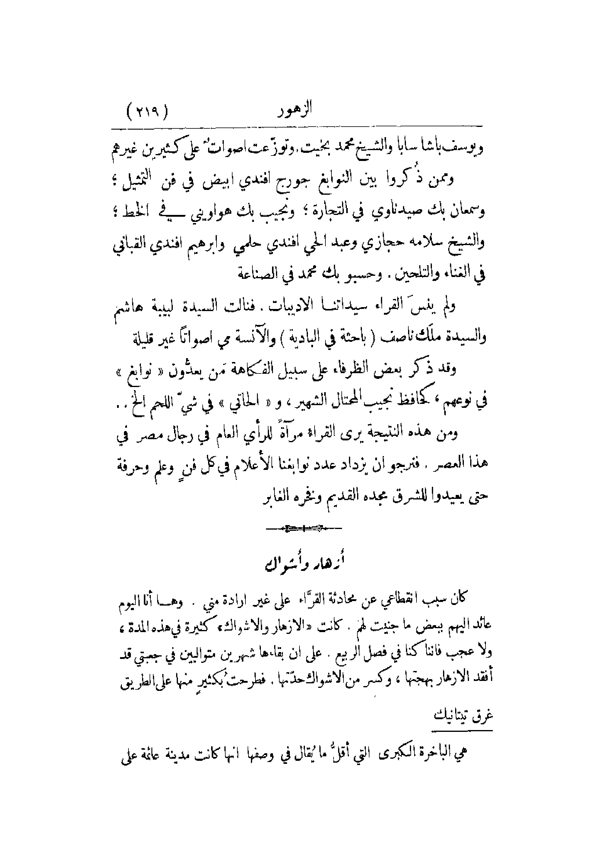 كان سبب انقطاعي عن محادثة القرَّاء على غير إرادة مني. وها أنا اليوم عائد إليهم ببعض ما جنيت لهم. كانت الأزهار والأشواك كثيرة في هذه المدة , ولا عجب فإننا كنا في فصل الربيع. على أن بقاءها شهرين متواليين في جعبتي قد أفقد الأزهار بهجتها , وكسر من الأشواك حدّتها. فطرحتُ بكثير منها على الطريق.