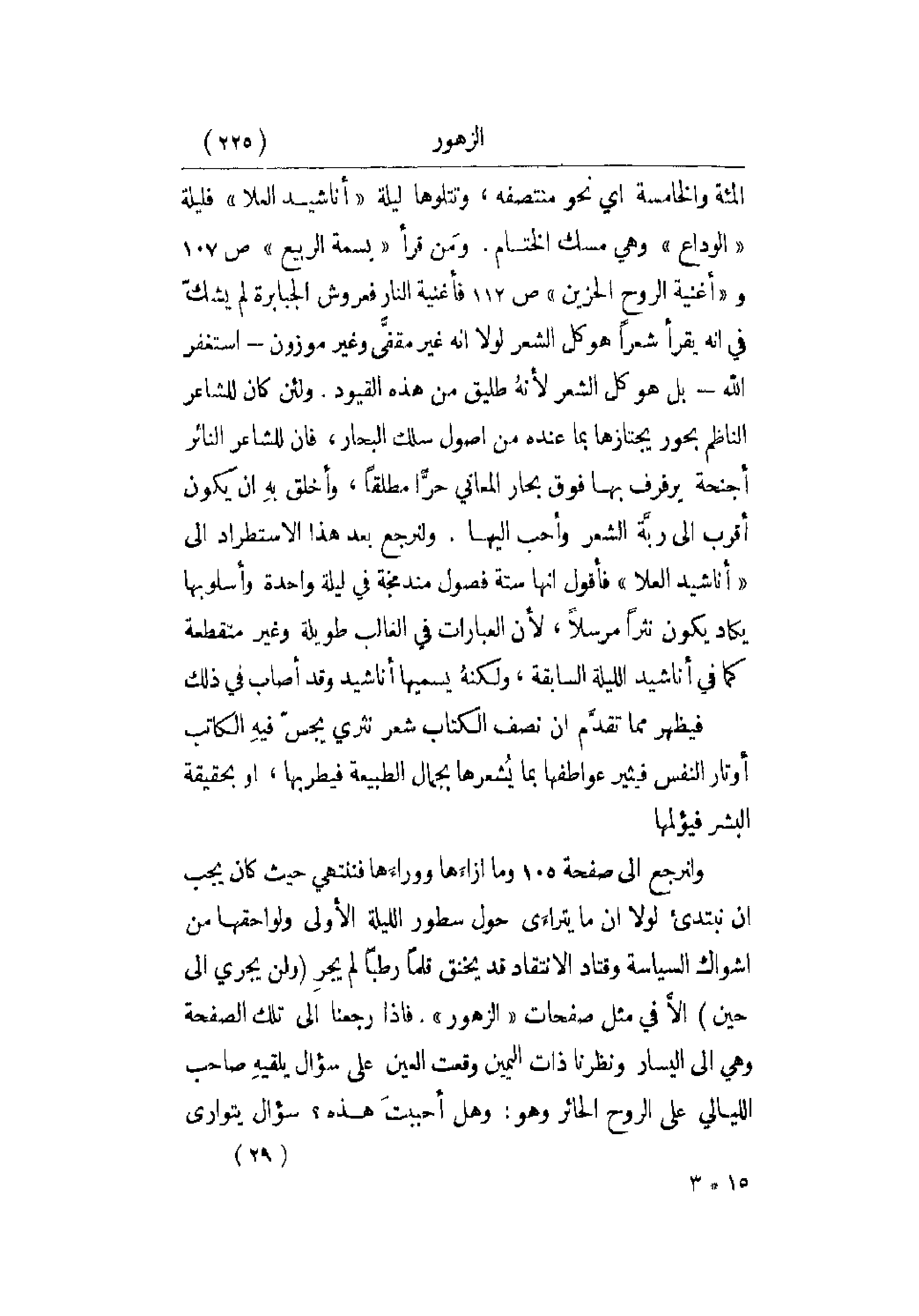 المئة والخامسة أي نحو منتصفه , وتتلوها ليلة أناشيد العلا فليلة الوداع وهي مسك الختام. ومَن قرأ بسمة الربيع ص 107 وأغنية الروح الحزين ص 112 فأغنية النار فعرش الجبابرة لم يشكّ في أنه يقرأ شعراً هو كل الشعر لولا أنه غير مقفَّى وغير موزون - استغفر الله - بل هو كل الشعر لأنهُ طليق من هذه القيود. ولئن كان للشاعر الناظم بحور يجتازها بما عنده من أصول سلك البحار , فإن للشاعر الناثر أجنحة يرفرف بها فوق بحار المعاني حرًّا مطلقاً , وأخلق بهِ أن يكون أقرب إلى ربَّة الشعر وأحب إليها. ولنرجع بعد هذا الاستطراد إلى أناشيد العلا فأقول أنها ستة فصول مندمجة في ليلة واحدة وأسلوبها يكاد يكون نثراً مرسلاً , لأن العبارات في الغالب طويلة وغير متقطعة كما في أناشيد الليلة السابقة , ولكنهُ يسميها أناشيد وقد أصاب في ذلك. فيظهر مما تقدَّم أن نصف الكتاب شعر نثري يجسّ فيهِ الكاتب أوتار النفس فيثير عواطفها بما يُشعرها بجمال الطبيعة فيطربها , أو بحقيقة البشر فيؤلمها. ولنرجع إلى صفحة 105 وما إزاءَها ووراءَ فننتهي حيث كان يجب أن نبتدئ لولا أن ما يتراءَى حول سطور الليلة الأولى ولو أحقها من أشواك السياسة وقتاد الانتقاد قد يخنق قلماً رطباً لم يجرِ