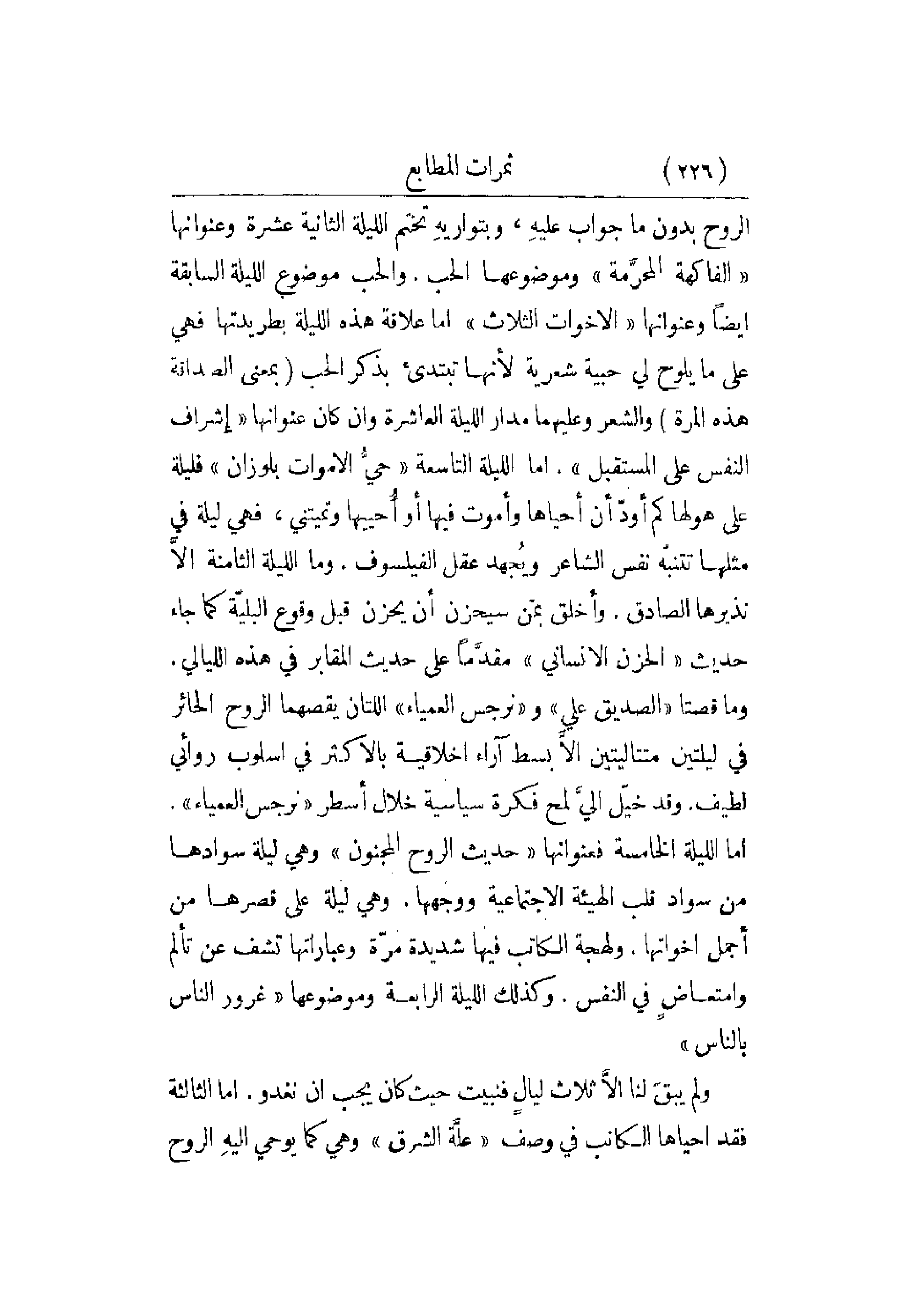 الروح بدون ما جواب عليهِ , وبتواريهِ تختم الليلة الثانية عشرة وعنوانها الفاكهة المحرَّمة وموضوعها الحب. والحب موضوع الليلة السابقة أيضاً وعنوانها الأخوات الثلاث أما علاقة هذه الليلة بطريدتها فهي على ما يلوح لي حبية شعرية لأنها تبتدئ بذكر الحب بمعنى الصداقة هذه المرة والشعر عليهما مدار الليلة العاشرة وإن كان عنوانها إشراف النفس على المستقبل. أما الليلة التاسعة حيُّ الأموات بلوزان فليلة على هولها كم أودّ أن أحياها وأموت فيها أو أُحييها وتميتني , فهي ليلة في مثلها تتنبّه نفس الشاعر ويُجهد عقل الفيلسوف. وما الليلة الثامنة إلاَّ نذيرها الصادق. وأخلق بمن سيحزن أن يحزن قبل وقوع البليّة كما جاء حديث الحزن الإنساني مقدَّماً على حديث المقابر في هذه الليالي. وما قصتا الصديق علي ونرجس العمياء اللتان يقصهما الروح الحائر في ليلتين متتاليتين إلاَّ بسط آراء أخلاقية بالأكثر في أسلوب روائي لطيف. وقد خيّل إليَّ لمح فكرة سياسية خلال أسطر نرجس العمياء. أما الليلة الخامسة فعنوانها حديث الروح المجنون وهي ليلة سوادها من سواد قلب الهيئة الاجتماعية ووجها. وهي ليلة على قصرها من أجمل أخواتها. ولهجة الكاتب فيها شديدة مرّة وعباراتها تشف عن تألم وامتعاض في النفس. وكذلك الليلة الرابعة وموضوعها غرور الناس بالناس ولم يبق لنا إلاَّ ثلاث فنبيت حيث كان أن نغدو. أما الثالثة فقد أحياها الكاتب في وصف علَّة الشرق وهي كما يوحي إليهِ الروح