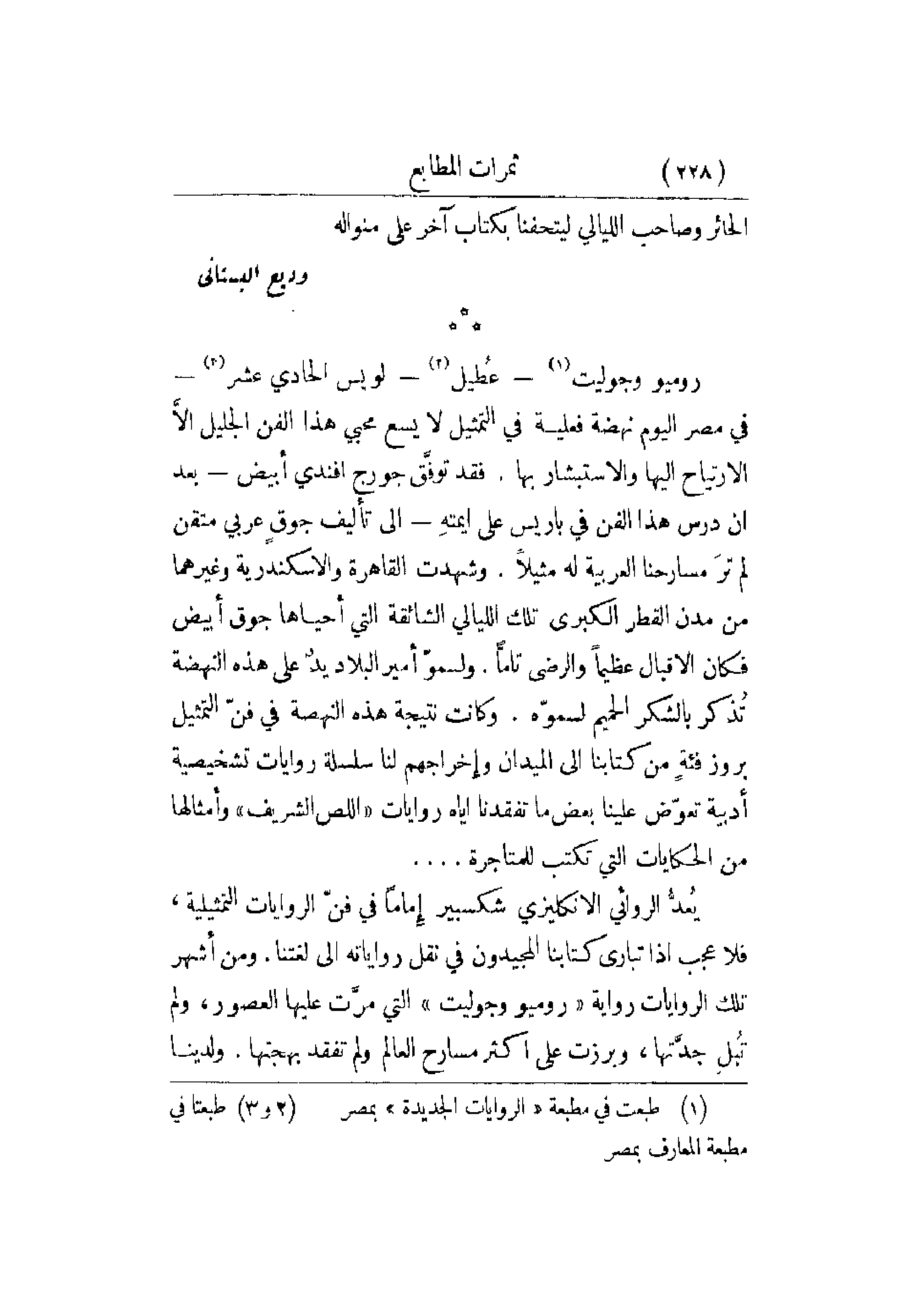 روميو وجوليت - عُطيل - لويس الحادي عشر - في مصر اليوم نهضة فعلية لا يسع هذا الفن الجليل إلاَّ الارتياح إليها والاستبشار بها. فقد توفَّق جورج أفندي أبيض - بعد أن درس هذا الفن في باريس على ايمتهِ - إلى تأليف جوقٍ عربي متقن لم ترَ مسارحنا العربية له مثيلا. وشهدت القاهرة والإسكندرية وغيرهما من مدن القطر الكبرى تلك الليالي الشائقة التي أحياها جوق أبيض فكان الإقبال عظيماً والرضي تامًّا. ولسمو أمير البلاد يدٌ على هذه النهضة تُذكر بالشكر الحميم لسموّه. وكانت نتيجة هذه النهضة في فنّ التمثيل بروز فئة من كتابنا إلى الميدان وإخراجهم لنا سلسة روايات تشخيصية أدبية تعوّض علينا بعض ما تفقدنا إياه روايات اللص الشريف وأمثالها من الحكايات التي نكتب للمتاجرة. . . يعد الروائي الانكليزي شكسبير إِماماً في فنّ الروايات التمثيلية , قلا عجب إذا تبارى كتابنا المجيدون في نقل رواياته إلى لغتنا. ومن أشهر تلك الروايات رواية روميو وجوليت التي مرّت عليها العصور , ولم تُبل جدَّتها , وبرزت على أكثر مسارح العالم ولم تفقد بهجتها. ولدينا