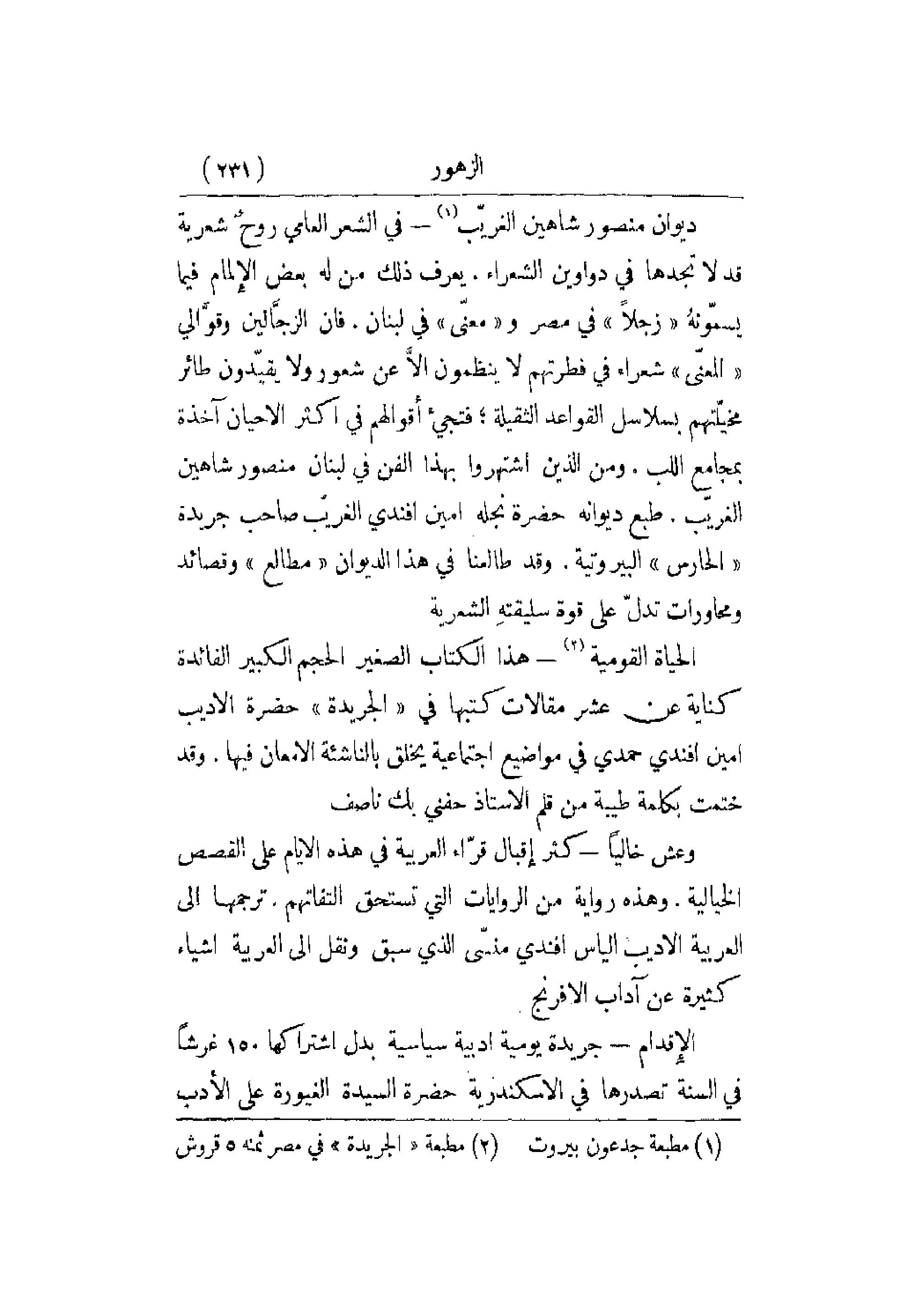 ديوان منصور شاهين الغريب - في الشعر العامي روحٌ شعرية قد لا تجدها في دواوين الشعراء. يعرف ذلك من له بعض الإِلمام فيما يسمّونهُ زجلاً في مصر ومعنّى في لبنان. فأن الزجَّالين وقوَّالي المعنى شعراء في فطرتهم لا ينظمون إلاَّ عن شعور ولا يقيّدون طائر مخيّلتهم بسلاسل القواعد الثقيلة؛ فتجيء أقوالهم في أكثر الأحيان آخذة بمجامع اللب. ومن الذين اشتهروا بهذا الفن في لبنان منصور شاهين الغريّب. طبع ديوانه حضرة نجله أمين