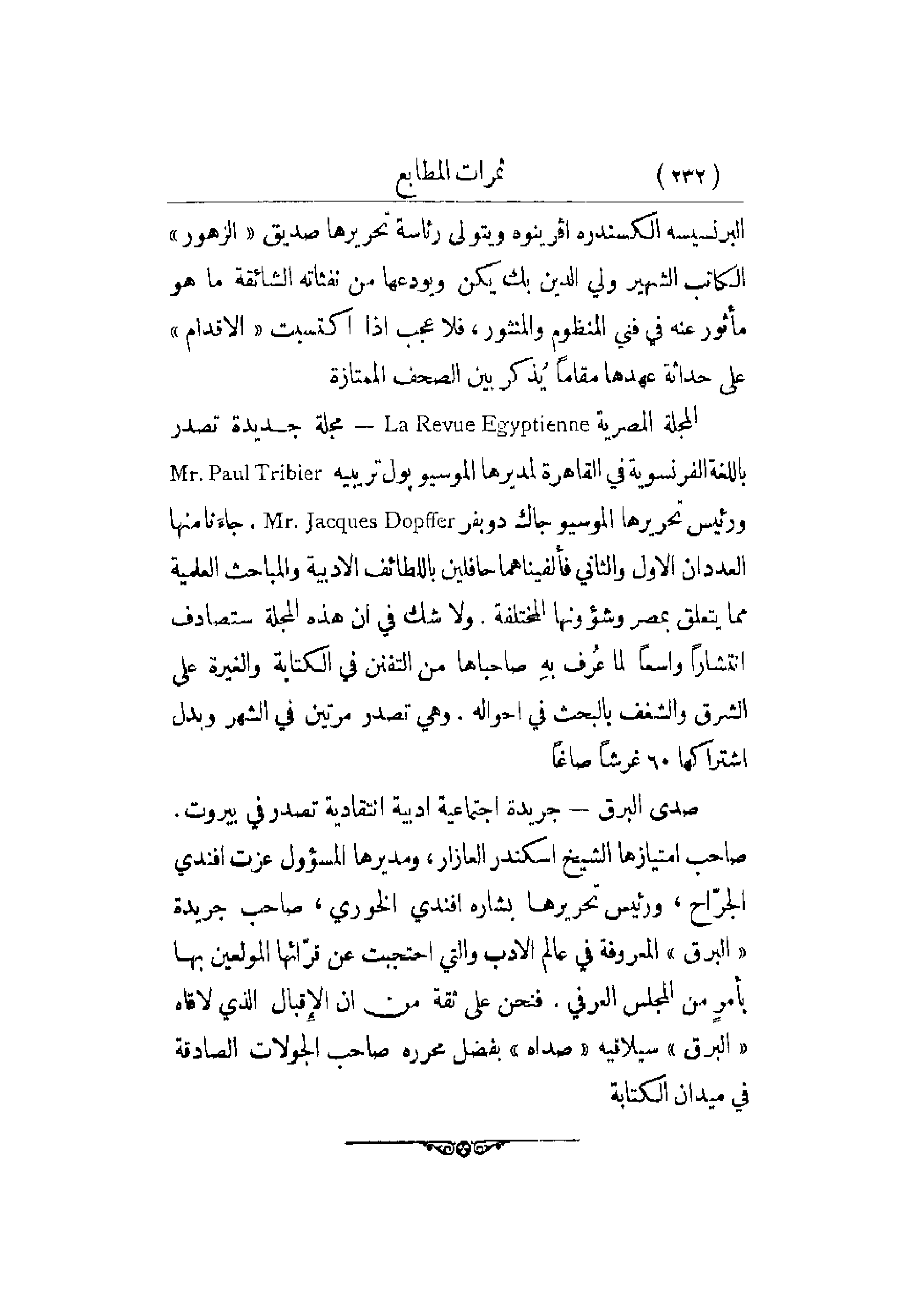 المجلة المصرية - مجلة جديدة تصدر باللغة الفرنسوية في القاهرة لمديرها الموسيوبول تريبيه ورئيس تحريرها الموسيو جاك دوبفر جاءَنا منها العددان الأول والثاني فألفينا هما حافلين باللطائف الأدبية والمباحث العلمية مما يتعلق بمصر وشؤونها المختلفة. ولا شك في هذه المجلة ستصادف انتشاراً واسعاً لما عُرف بهِ صاحباها من التفنن في الكتابة والغيرة على الشرق والشغف بالبحث في أحواله. وهي تصدر مرتين في الشهر وبدل اشتراكها 60 غرشأً صاغاً.
