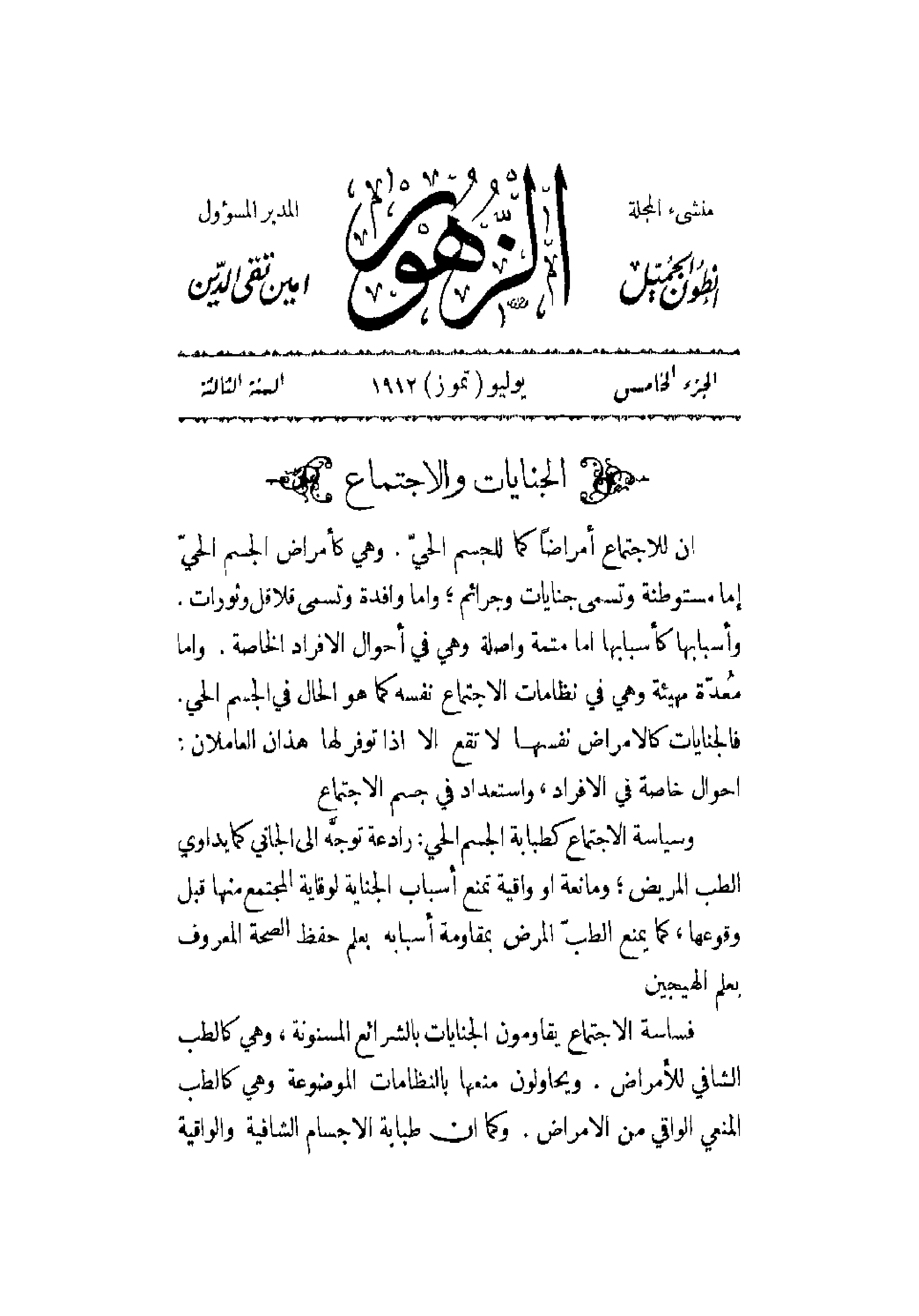 إن للاجتماع أمراضاً كما للجسم الحيّ. وهي كأمراض الجسم الحيّ إما مستوطنة وتسمى جنايات وجرائم؛ وأما وافدة وتسمى قلاقل وثورات. وأسبابها كأسبابها أما متمة واصلة وهي في أحوال الأفراد الخاصة. وأما مُعدّة مهيئة وهي في نظامات الاجتماع نفسه كما هو الحال في الجسم الحي. فالجنايات كالأمراض نفسها لا تقع إلا إذا توفر لها هذان العاملان: أحوال خاصة في الأفراد , واستعدوا في جسم الاجتماع. وسياسة الاجتماع كطبابة الجسم الحي: رداعة توجَّه إلى الجاني كما يداوي الطب المريض؛ ومانعة أو واقية تمنع أسباب الجناية لوقاية المجتمع منها قبل وقوعها , كما يمنع الطبّ المرض بمقاومة أسبابه بعلم حفظ الصحة المعروف بعلم الهيجين. فسافة الاجتماع يقاومون الجنايات بالشرائع المسنونة , وهي كالطب الشافي للأمراض. ويحاولون بالنظامات الموضوعة وهي كالطب المنعي الواقي من الأمراض. وكما أن طبابة الأجسام الشافية والواقية
