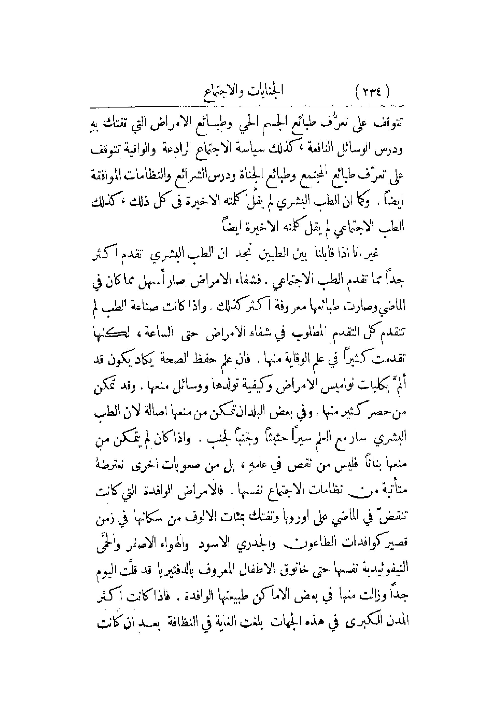 الرادعة والواقية تتوقف على تعرّف طبائع الجناة ودرس الشرائع والنظامات الموافقة أيضاً. زكما أن الطب البشري لم يقُل كلمته الأخيرة في كل ذلك , كذلك الطب الاجتماعي لم يقل كلمته الأخيرة أيضاً. غير أنا إذا قابلنا بين الطبين نجد أن الطب البشري تقدم أكثر جداً مما تقدم الطب الاجتماعي. فشفاء الأمراض صار أسهل مما كان في الماضي وصارت طبائعها معروفة أكثر كذلك. وإذا كانت صناعة الطب لم تتقدم كل التقدم المطلوب في شفاءِ الأمراض حتى الساعة , لكنها تقدمت كثيراً في علم الوقاية منها. فإن علم حفظ الصحة يكاد يكون قد ألمَّ بكليات نواميس الأمراض وكيفية تولدها ووسائل منعها. وقد تمكن من حصر كثير منها. وفي بعض البلدان تمكن من منعها أصالة لأن الطب البشري سار مع العلم سيراً حثيثاً وجنباً لجنب. وإذا كان لم يتمكن من منعها بتاتاً فليس من نقص في علمهِ , بل من صعوبات أخرى تعترضهُ متأتية من نظامات الاجتماع نفسها. فالأمراض الوافدة التي كانت تنقضّ في الماضي على أوروبا وتفتك بمئات الألوف من سكانها في زمن قصير كوافدات الطاعون والجدري الأسود والهواء الأصفر والحمَّى التيفوئيدية نفسها حتى خانوق الأطفال المعروف بالدفثيريا قد قلَّت اليوم جداً وزالت منها في بعض الأماكن طبيعتها الوافدة. فإذا كانت أكثر المدن الكبرى في هذه الجهات بلغت الغاية في النظافة بعد أن كانت