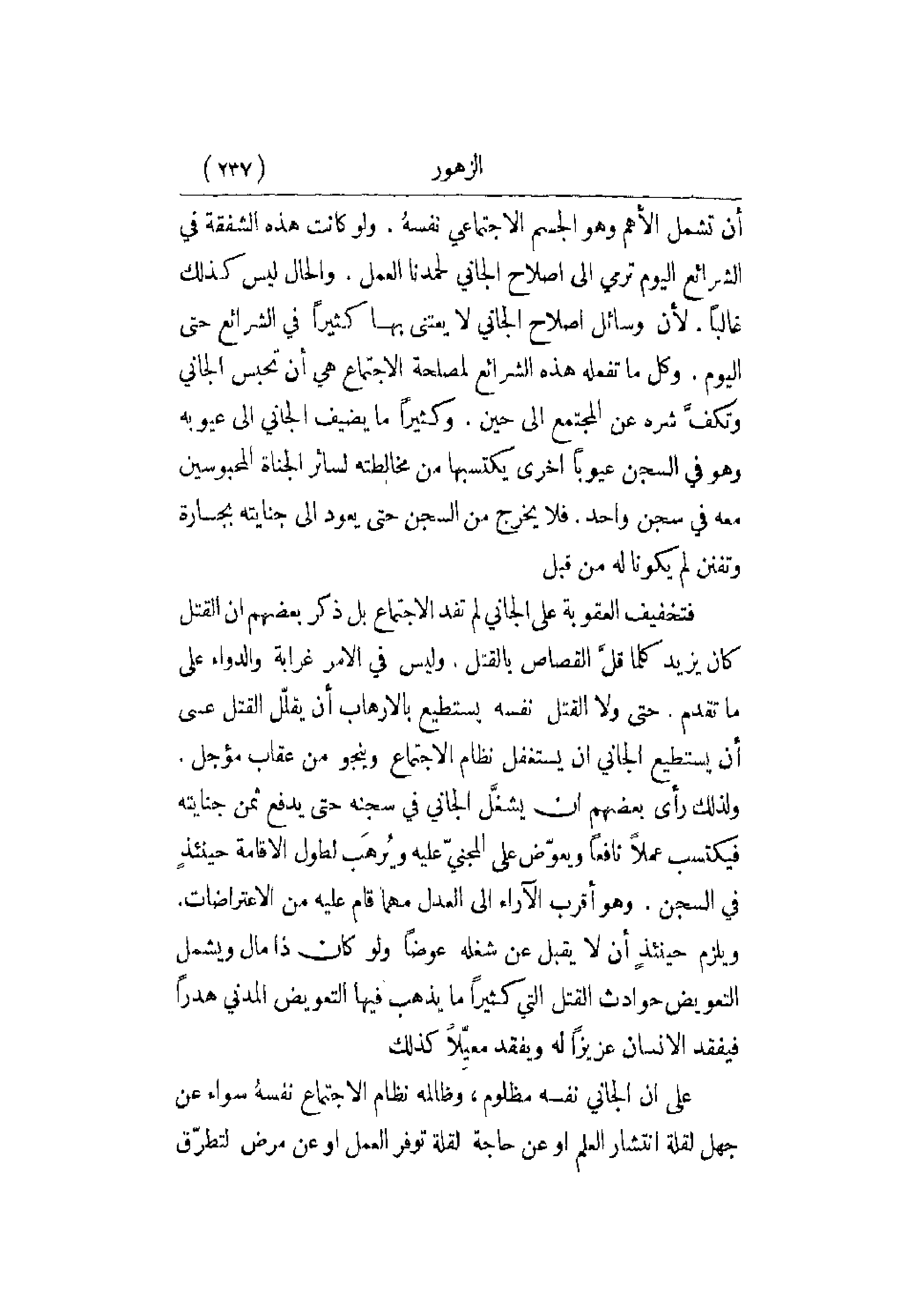 أن تشمل الأهم وهو الجسم الاجتماعي نفسهُ. ولو كانت هذه الشفقة في الشرائع اليوم ترمي إلى إصلاح الجاني لا يعتني بها كثيراً في الشرائع حتى اليوم. وكل ما تفعله هذه الشرائع لمصلحة الاجتماع هي أن تحبس الجاني وتكفَّ شره عن المجتمع إلى حين. وكثيراً ما يضيف الجاني إلى عيوبه وهو في السجن عيوباً أخرى يكتسبها من مخالطته لسائر الجناة المحبوسين معه في سجن واحد. فلا يخرج من السجن حتى يعود إلى جنايته بجسارة وتفنن لم يكونا له من قبل. فتخفيف العقوبة على الجاني لم تفد الاجتماع بل