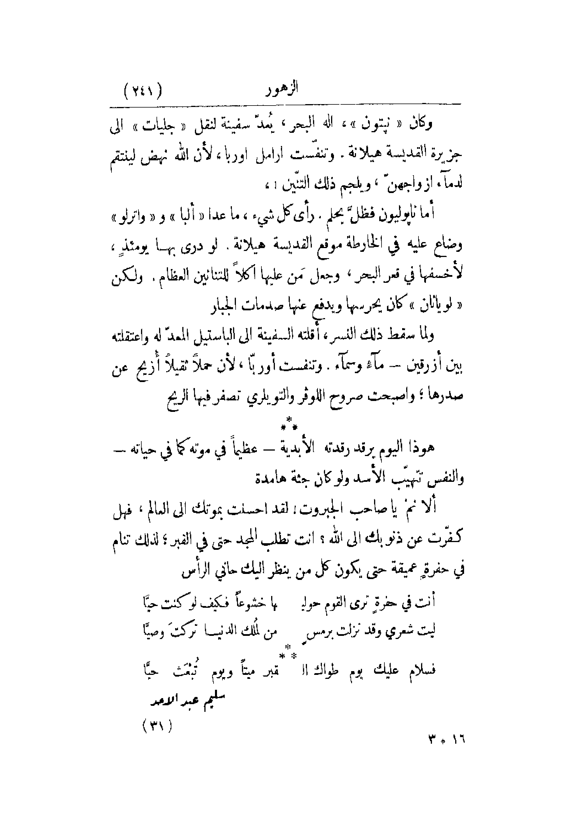 وكان نبتون إله البحر , يٌعدّ سفينة لنقل جليات إلى جزيرة القديسة هيلانة. وتنفّست أرامل أوربا , لأن الله نهض لينتقم لدماء أزواجهنّ , ويلجم ذلك التنّين! , أما نابوليون فظلَّ يحلم. رأى كل شيء , ما عدا ألبا وواترلو وضاع عليه في الخارطة موقع القديسة هيلانة. لو درى بها يومئذٍ , لأخسفها في قعر البحر , وجعل من عليها أكلاً للتنانين العظام. ولكن لويائان كان يحرسها ويدفع عنها صدمات الجبار. ولما سقط ذلك النسر , أقلته السفينة إلى الباستيل المعدّ له واعتقله بين أزرقين - ماءٍ وسماء. وتنفست أوربّا , لأن حملاً ثقيلاً أُزيح عن صدرها؛ وأصبحت صروح اللوفر والويلري تصفر فيها الريح.