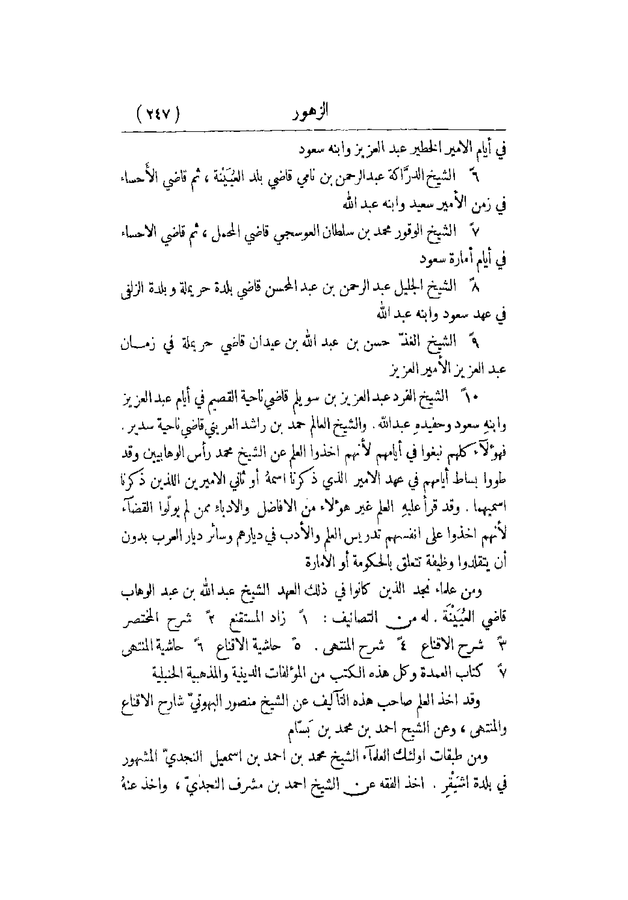 عن الشيخ محمد رأس الوهابيين قد طووا بساط أيامهم في عهد الأمير الذي ذكرنا اسمهُ أو ثاني الأمير بن اللذين ذكرنا اسميهما. وقد قرأ عليهِ العلم غير هؤلاء من الأفاضل والأدباءِ ممن لم يوّلوا القضاء لأنهم أخذوا على أنفسهم تدريس العلم والأدب في ديارهم وسائر ديار العرب بدون أن يتقلدوا وظيفة تتعلق بالحكومة أو الإمارة. ومن علماء نجد الذين كانوا في ذلك العهد الشيخ عبد الله بن عبد الوهاب قاضي العُييْنَة. له من التصانيف: 1ً زاد المستقنع 2ً شرح المختصر 3ً شرع الأقناع 4ً شرح المنتهى 5ً حاشية الإقناع 6ً حاشية المنتهى 7ً كتاب العمدة وكل هذه التأليف عن الشيخ منصور البهوتيّ شارح الإقناع والمنتهى , وعن الشيخ أحمد بن محمد بن بَسّام. ومن طبقات أولئك العلماء الشيخ محمد بن أحمد بن إسماعيل النجديّ المشهور في بلدة أشَقْرِ. أخذ الفقه عن الشيخ أحمد بن مشرف النجديّ , وأخذ عنهُ