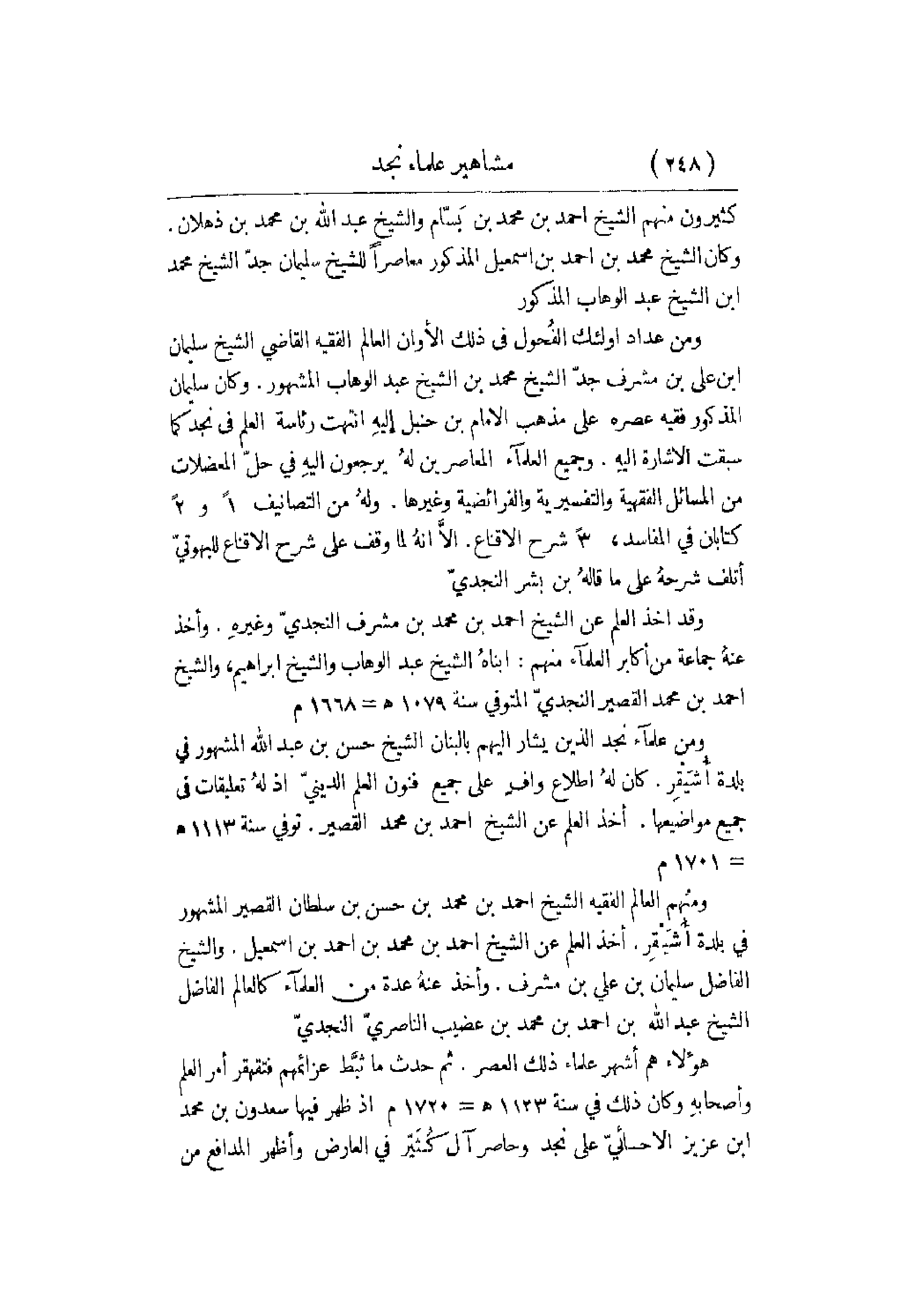 كثيرون منهم الشيخ أحمد بن محمد بن بَسّام والشيخ عبد الله بن ذهلان. وكان الشيخ محمد بن أحمد بن اسمعيل المذكور معاصراً للشيخ سليمان محمد بن الشيخ عبد الوهاب المذكور. ومن عداد أولئك الفُحول في ذلك الأوان العالم الفقيه القاضي الشيخ سليمان ابن علي بن مشرف جدّ الشيخ محمد بن الشيخ عبد الوهاب المشهور. وكان سليمان المذكور فقيه عصره على مذهب الإمام بن حنبل إليهِ انتهت رئاسة العلم في نجد كما سبقت الإشارة إليهِ. وجميع العلماء المعاصرين لهُ يرجعون إليهِ في حلّ المعضلات من المسائل الفقهية والتفسيرية والفرائضية وغيرها. ولهُ من التصانيف 1ً و2ً كتابان في المفاسد , 3ً شرح الإقناع. إلاَّ أنهُ لما وقف على شرح الإقناع للبهوتيّ أتلف شرحهُ على ما قالهُ بن بشر النجديّ. وقد أخذ العلم عن الشيخ أحمد بن محمد بن مشرف النجديّ وغيرهِ. وأخذ عنهُ جماعة من أكابر العلماء منهم: أبناهُ الشيخ عبد الوهاب والشيخ إبراهيم , والشيخ أحمد بن محمد القصير النجديّ المتوفي سنة 1079هـ=1668م ومن علماء نجد الذين يشار إليهم بالبنان الشيخ حسن بن سلطان القصير المشهور في بلدة أُشَيْقر. أخذ العلم عن الشيخ أحمد بن محمد بن أحمد بن اسمعيل. والشيخ الفاضل سليمان بن علي بن مشرف. وأخذ عنهُ عدة من العلماء كالعالم الفاضل الشيخ عبد الله بن أحمد بن محمد بن عضيب الناصريّ النجديّ. هؤلاء هم أشهر علماء ذلك العصر. ثم حدث ما ثبَّط عزائمهم فتقهقر أمر العلم وأصحابهِ وكان ذلك في سنة 1133هـ=1720م إذ ظهر فيها سعدون بن محمد